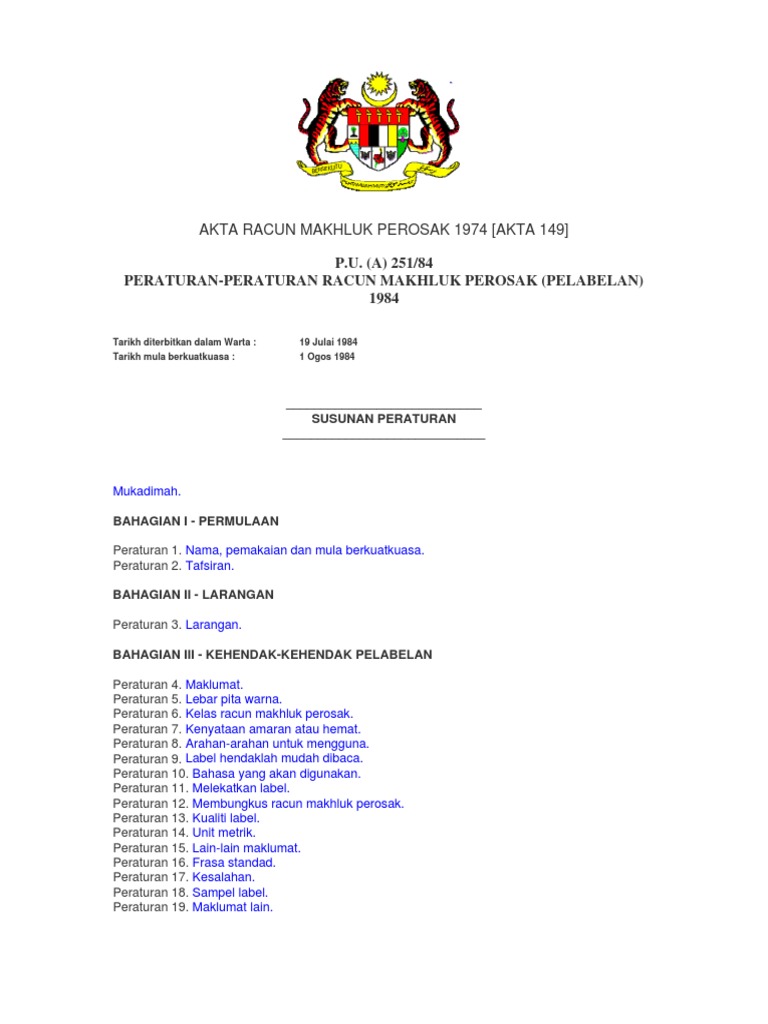 Akta racun makhluk perosak 1974 akta 149. Akta ini juga dikenali dengan nama akta 149 yang melibatkan banyak perkara mengenai racun makhluk perosak dan undang undang yang terlibat dengannya. Garis panduan amalan baik pengurusan bahan kimia di pihak berkuasa t empatan 2 x kelengkapan pelindung diri ppe fasa 2 peraturan peraturan keselamatan. Akta pengangkutan melalui udara 1974. Akta racun makhluk perosak 1974 ialah satu undang undang yang digubal bagi mengawal berbagai aspek yang berkaitan dengan racun makhluk perosak yang mana meliputi.