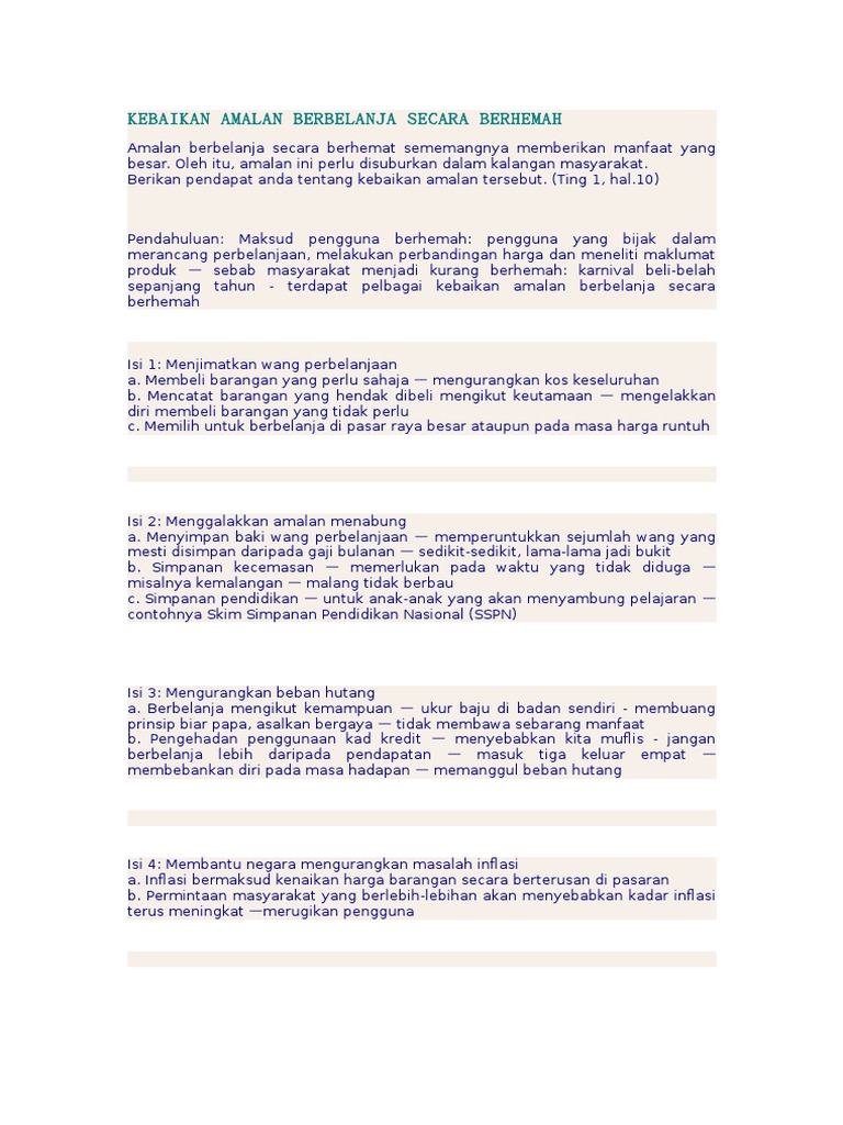 Kebaikan amalan berbelanja secara berhemah pendahuluan. Karangan bahasa melayu spm pt3. Kebaikan amalan berbelanja secara berhemah pendahuluan. Pengguna yang bijak dalam merancang perbelanjaan melakukan perbandingan harga dan meneliti maklumat produk sebab masyarakat menjadi kurang berhemah.