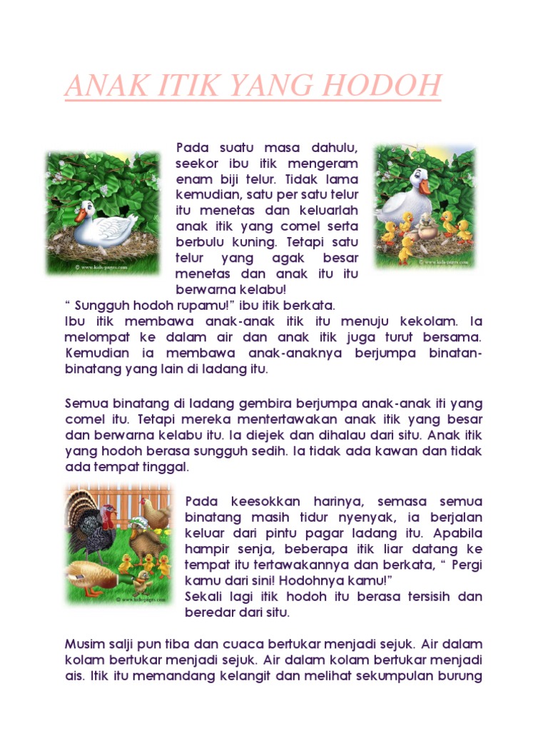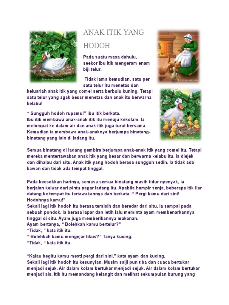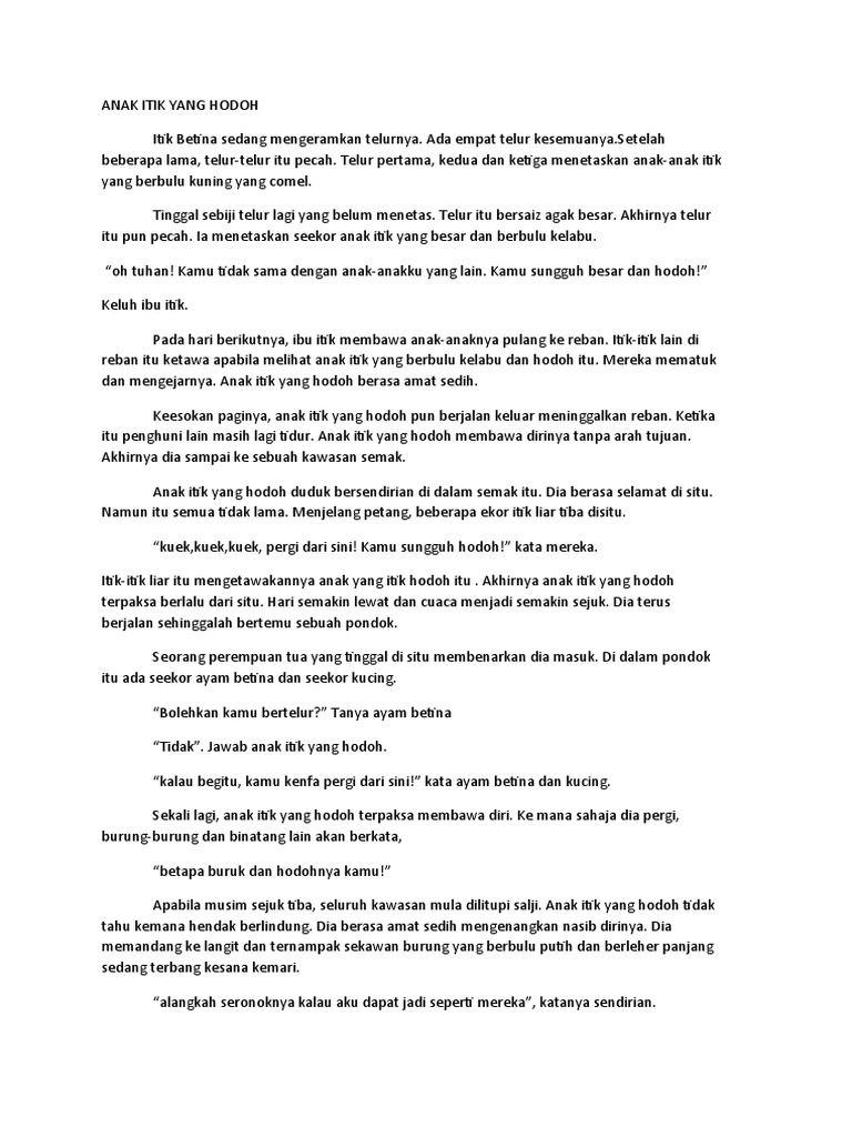 Anak itik yang hodoh pdf. Ada seekor ibu itik sedang menanti 6 biji telurnya menetas. Anak itik yang hodoh berasa sungguh sedih. Apabila hampir senja beberapa itik liar dating. Pada keesokkan harinya semasa semua binatang masih tidur nyenyak ia berjalan keluar dari pintu pagar ladang itu.