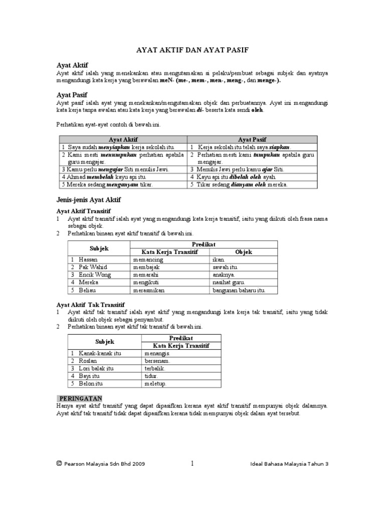 Untuk pemahaman para pelajar laman web ini telah menyediakan beberapa soalan percubaan spm di jadual bawah murid murid digalak menganalisis caranya menukar ayat dari aktif ke pasif dan sebaliknya. Rumah kami kata. 1 emak saya membeli sayur dan ikan di pasar a ayat aktif b ayat pasif 2 dia melukis gambar pemandangan dasar laut. A ayat aktif b ayat pasif 11 ale menyiapkan latihan yang banyak di dalam biliknya.