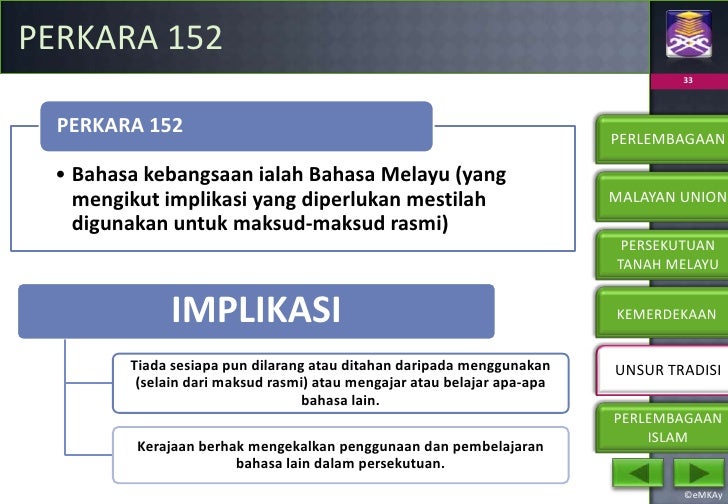 Perkara152 ini telah mengiktiraf dan menjadikan bahasa melayu sebagai bahasa kebangsaan serta bahasa rasmi negara.