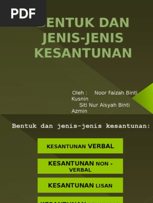 Bentuk dan jenis kesantunan. Kesantunan verbal kesantunan berbahasa daripada segi verbal merujuk kepada percakapan lisan dan pertuturan. Kesantunan verbal kesantunan bukan verbal kesantunan verbal komunikasi seharian dengan menggunakan bahasa secara sopan dan beradab dikenali sebagai kesantunan berbahasa kesantunan berbahasa bermaksud kesopanan dan kehalusan ketika menggunakan bahasa baik dalam bentuk lisan atau tulisan. Budi bahasa adalah sangat maslahat dan mesti diamalkan oleh setiap orang tidak kira sesiapa dan seseorang itu berada supaya perasaan orang lain tidak tersinggung. 3 2 kesantunan verbal amat juhairi muin 1992 kesopanan dan kehalusan bahasa ketika berkomunikasi sama ada dalam lisan atau tulisan kepada orang yang dihormati setaraf dengan kita atau orang yang berkedudukan lebih rendah.