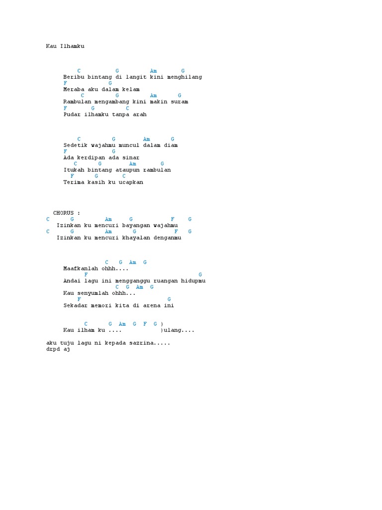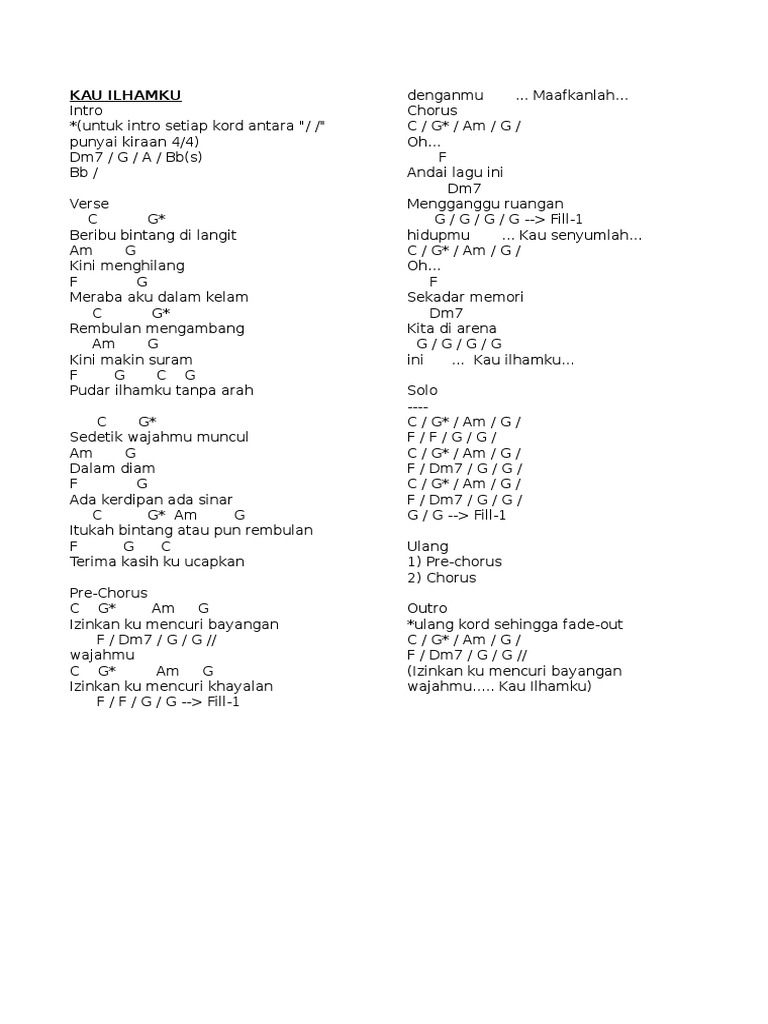 12 41 pg delarocca no comments. Em dan bila semua tercipta c hanya untuk ku merasakan g semua yang tercipta bm hampa hidup terasa. Sabtu 19 oktober 2019 14 04. Kord gitar guitar chord man bai kau ilhamku c g am g beribu bintang di langit kini menghilang f g meraba aku dalam kelam c g am g rambulan mengambang kini makin suram f g c pudar ilhamku tanpa arah c g am g sedetik wajahmu muncul dalam diam f g ada kerdipan ada sinar c g am g itukah bintang ataupun rambulan f g c terima kasih ku ucapkan chorus.