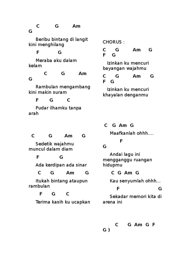 F g genggam tangan kecup keningmu em am dekap dan usap rambutmu dm g c bagiku kau memang bintang terindah. Am dm g c c7 tak ku siakan kesempatan terindah. C g am em f g c g am em maafkan aku yang selalu menyakitimu f c dm g mengecewakanmu dan meragukanmu c g am em tersadar aku bila kamu yang terbaik f c dm g terima aku mencintaiku apa adanya reff. Di antara beribu bintang hanya kaulah yang paling terang f c dm g di antara beribu cinta pilihanku.
