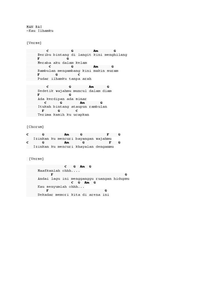 Man bai kau ilhamku verse c g am g beribu bintang di langit kini menghilang f g meraba aku dalam kelam c g am g rambulan mengambang kini makin suram f g c pudar ilhamku tanpa arah c g am g sedetik wajahmu muncul dalam diam f g ada kerdipan ada sinar c g am g itukah bintang ataupun rambulan f g c terima kasih ku ucapkan chorus c g am g f g. Chorus f g melihat senyum manismu em am tawa canda di wajahmu dm g c c7 cukup buatku rasakan bahagia. Chord kunci gitar dan lirik lagu di antara bintang hello di antara beribu bintang hanya kaulah berikut chord kunci gitar versi termudah dan lirik lagu di antara bintang yang dipopulerkan hello.
