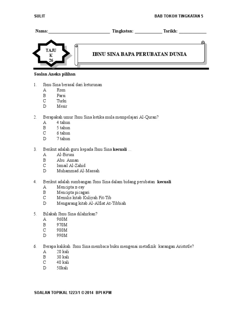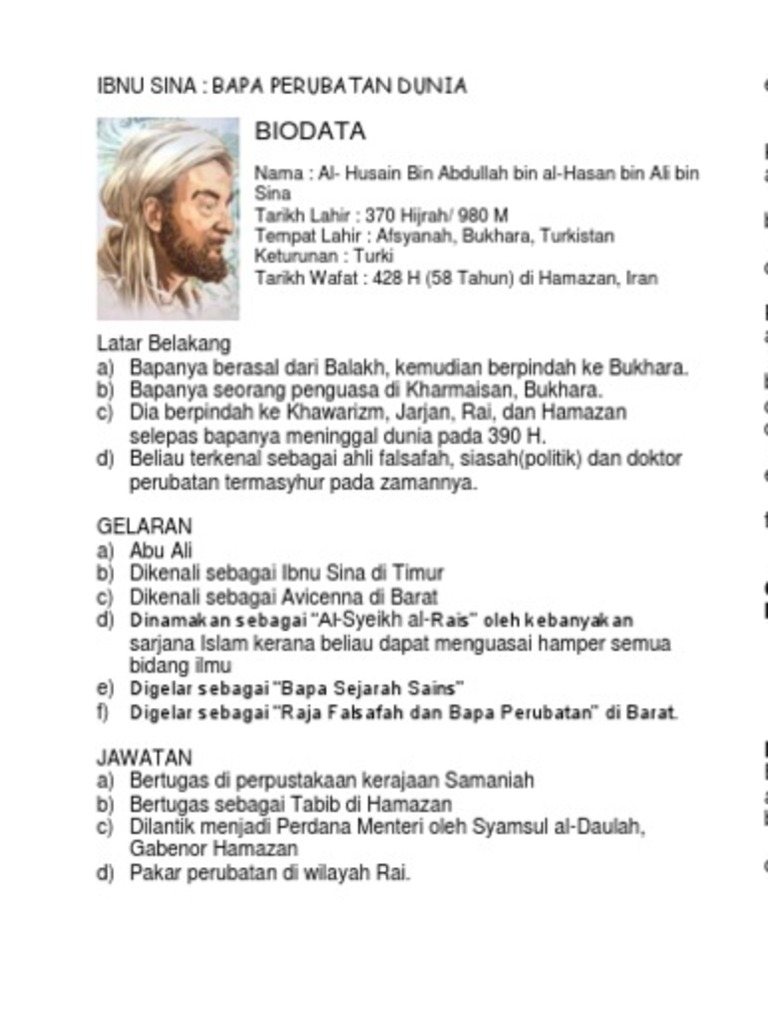 Perkara biodata nama al husain bin abdullah bin hassan bin ali bin sina tahun lahir 370 hijrah 980 masihi tempat lahir afsyanah bukhara turkistan keturunan turki gelaran ibnu sina di timur dan avicenna di barat wafat 428 hijrah 1037 masihi di hamazan maklumat lain pernah bertugas sebagai pakar perubatan di wilayah. Ibnu sina dilahirkan di bukhara turkistan ibnu sina dilahirkan pada tahun 980 masihi ibnu sina menghafal al quran pada usia 10 tahun ibnu sina berkhidmat sebagai pegawai perubatan di wilayah rai guru yang mengajar fekah dan tasawwuf kepada ibnu sina ialah ismail al zahid di barat ibnu sina dikenali dengan nama avicenna ibnu sina pernah membaca buku metafizik karangan. Ibnu sina dilahirkan sekitar tahun 980 a d. Penulisan barat telah menganggap ibnu sina sebagai bapa doktor kerana berjaya menyatupadukan teori perubatan yunani hippcrates dan gelen dan pengalaman dari ahli ahli perubatan dari india dan parsi dan serta pengalamannaya sendiri.