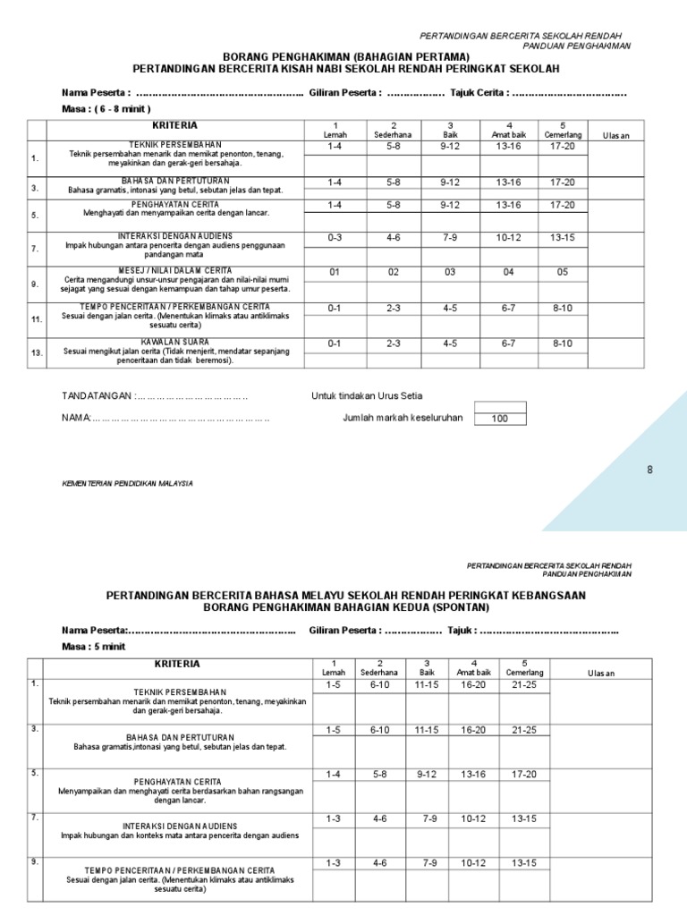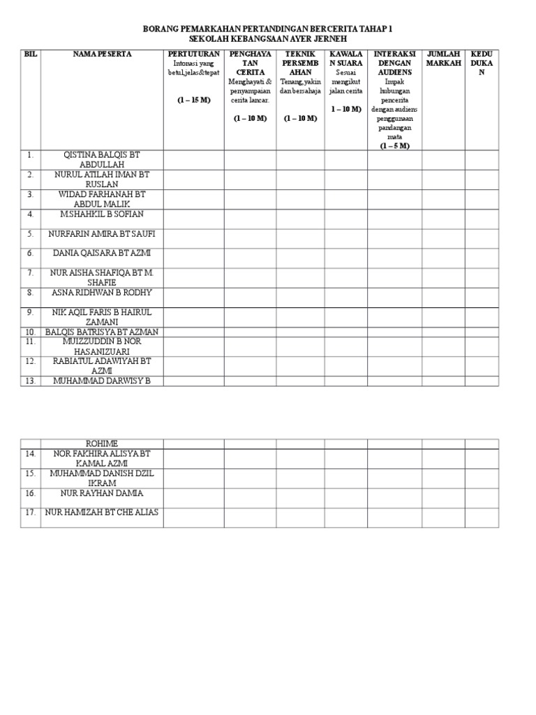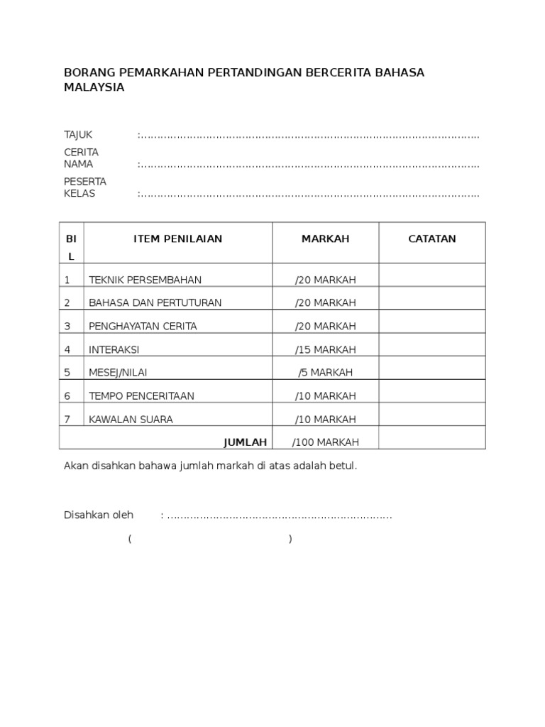 Borang pemarkahan pertandingan bercerita sekolah rendah. Mencungkil bakat dan kreativiti murid bercerita secara bersahaja dan menyakinkan. Borang pemarkahan pertandingan melukis poster antidadah karnival pendidikan pencegahan dadah peringkat daerah jasin 2009 bil kod nombor peserta tema 15m ilus. Borang pemarkahan pertandingan melukis poster antidadah karnival pendidikan pencegahan dadah peringkat daerah jasin 2009 bil kod nombor peserta tema 15m ilustrasi 25m gubahan komposisi olahan 30m warna bebas 20m kemasan 10m jumlah markah kategori 1 sekolah rendah kategori 2 menengah rendah sulit sulit 2. Borang pemarkahan pertandingan deklamasi sajak bulan kemerdekaan sempena ulang tahun kemerdekaan negara ke 57 sekolah kebangsaan pasir besar 73420 gemas negeri sembilan.