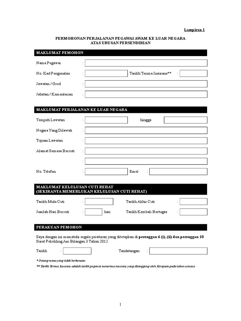 Maklumat perjalanan ke luar negara. Semua permohonan kelulusan perjalanan bertugas rasmi ke luar negara hendaklah dalam tiga 3 salinan dengan menggunakan borang seperti lampiran a. 124721434 tarikh kemaskini. 3 tahun 2012 mengenai peraturan perjalanan pegawai awam ke luar negara atas urusan persendirian permohonan lengkap perlu dikemukakan perlu disusuli dengan ketua jabatan penyokong masing masing selewat lewatnya satu 1 bulan sebelum tarikh perjalanan.