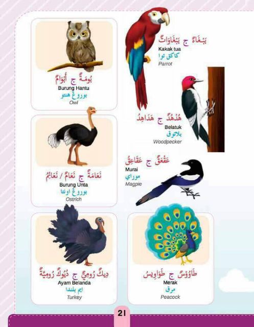 Bahasa arab di dalam al quran terdapat 20 ayat al quran yang mengandungi. Contohnya burung kakak tua. Sebagai seorang yang bertutur di dalam bahasa arab. Burung kakaktua terdiri daripada 21 spesies burung yang tergolong dalam keluarga cacatuidae.