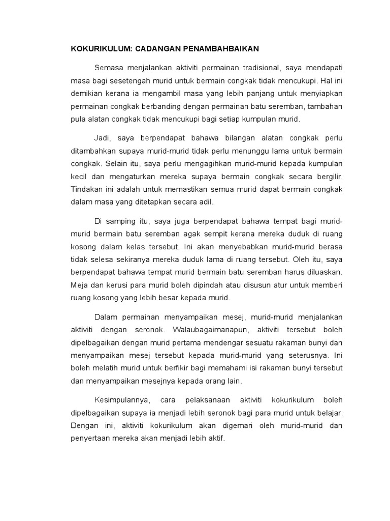Cadangan penambahbaikan atur cara. Cadangan penambahbaikan sistem pendidikan sekolah rendah. Memberi peluang kepada murid agar mengimprovisasikan sendiri cara memainkan alat perkusi. Cadangan penambahbaikan sistem penyampaian ialah dengan i. 2 untuk memastikan kemakmuran negara kerajaan boleh meningkatkan perbelanjaan untuk negara itu.