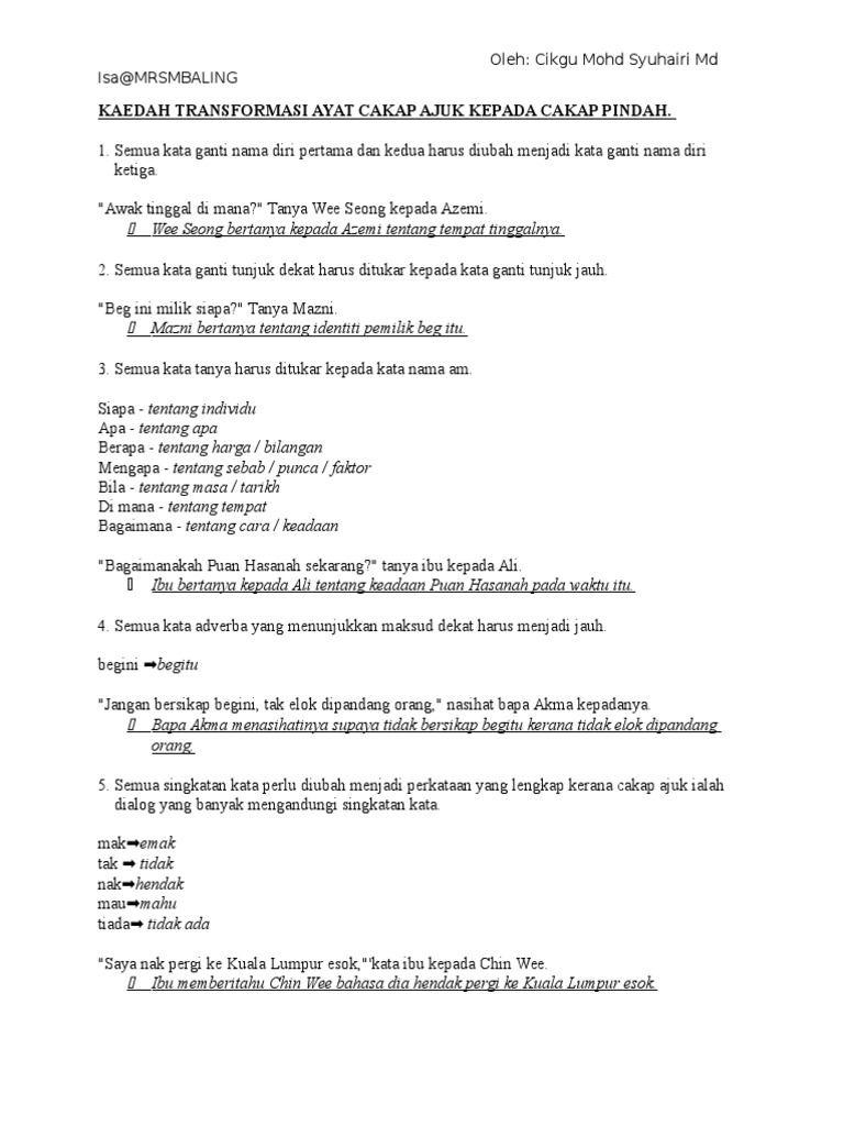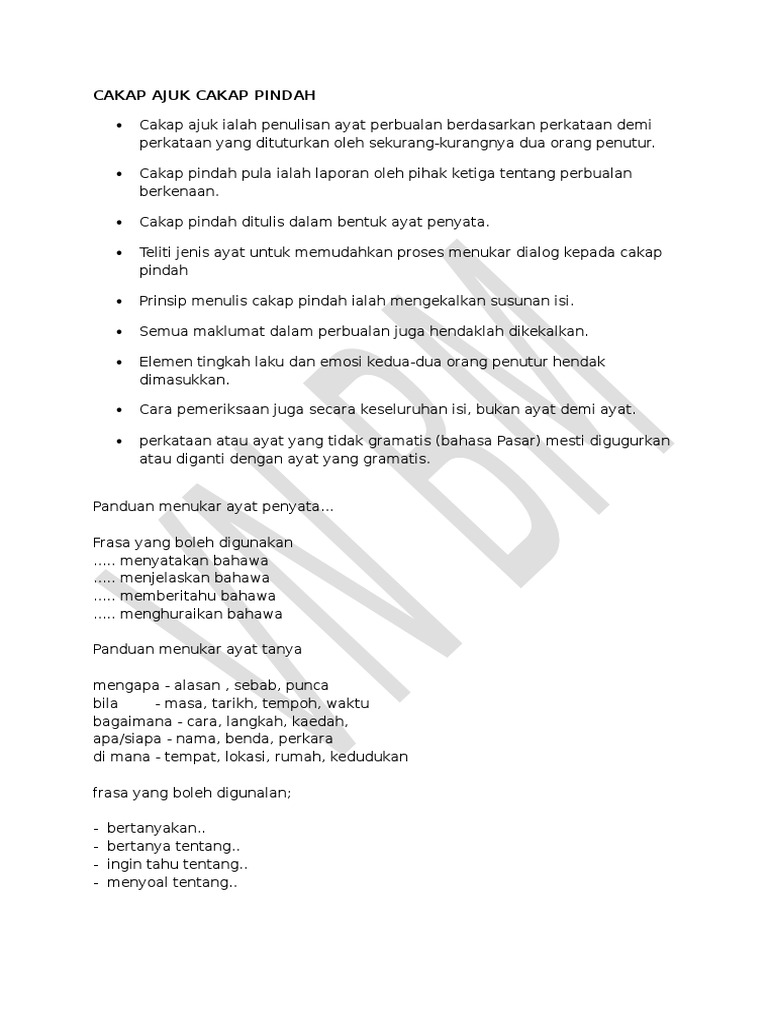 Cakap pindah cakap pindah merupakan percakapan seseorang ditulis semula dengan menyusun tatabahasa yang betul. Cakap ajuk cakap ajuk merupakan percakapan seseorang dituis semula perkataan diucapkan tanpa mengubah apa apa makna. Contoh ayat cakap ajuk 2 cikgu mokhtar. Bahasa melayu tahun 5.