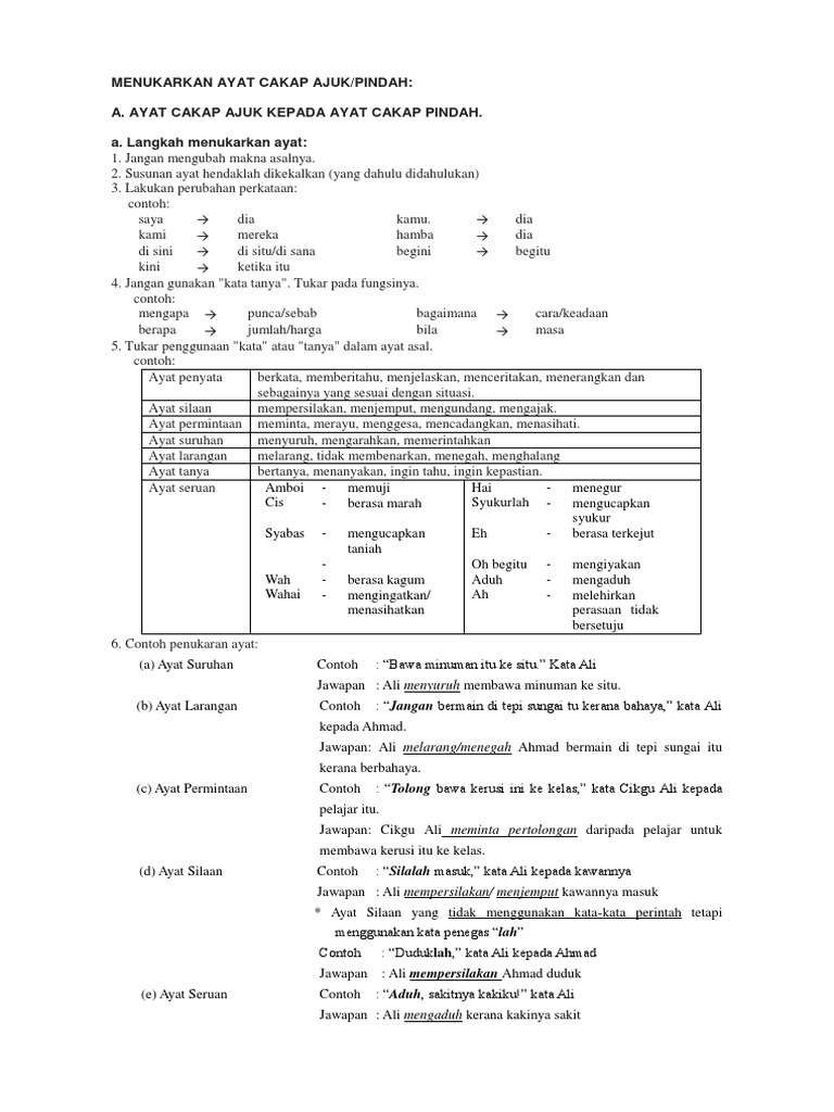 Cakap pindah cakap pindah merupakan percakapan seseorang ditulis semula dengan menyusun tatabahasa yang betul. Cakap ajuk cakap pindah 1 cakap ajuk ialah percakapan seseorang yang ditulis semula dalam bentuk ayat tanpa mengubah maksud asalnya 2 dalam penulisan cakap ajuk harus disertai tanda petik. Tidak saya tidak pernah terlibat dalam kes kecurian. Adik saya terjatuh ke longkang.