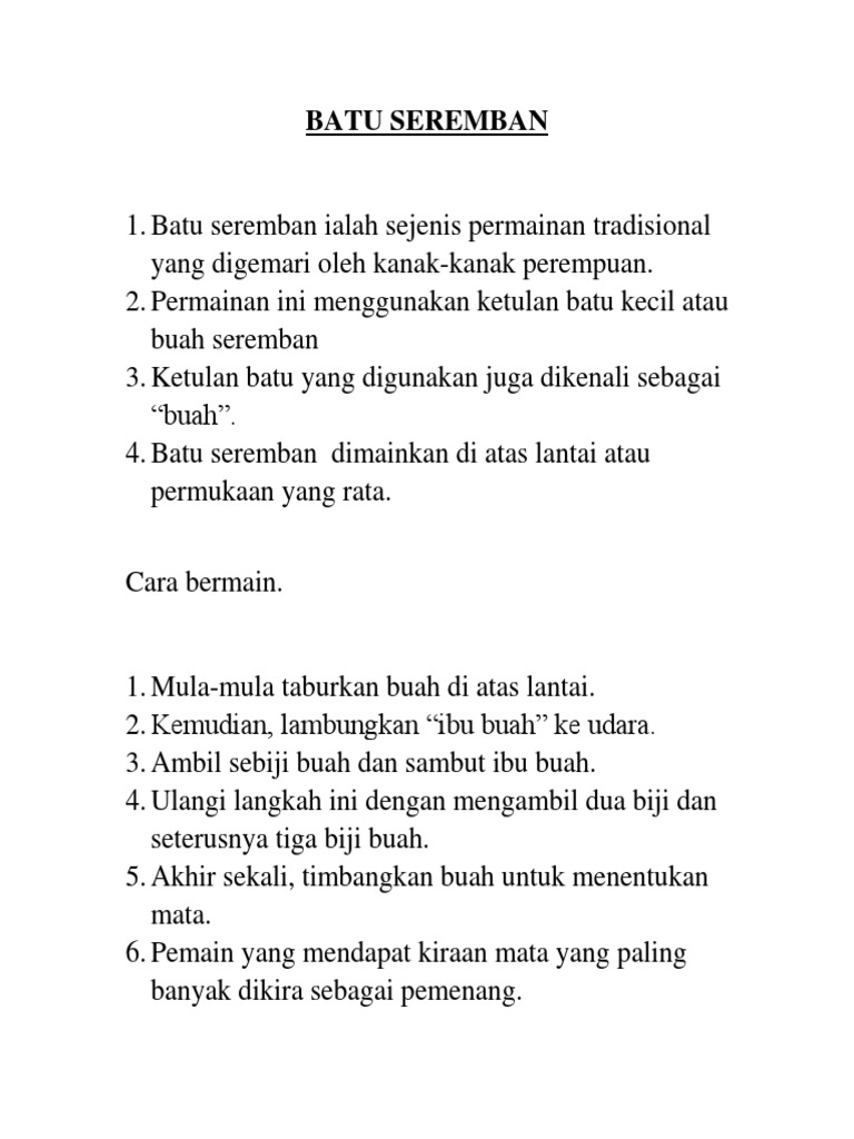 Cara main batu seremban 5. Permainan ini gemar dimain oleh kanak kanak perempuan. Keseluruhannya batu seremban ada lapan peringkat. Ia biasanya dimain secara berkumpulan dua orang atau lebih. Bermula dengan peringkat pertama yang mudah dengan menggunakan sebiji buah yang dinamakan sebagai buah satu hinggalah kepada peringkat lebih tinggi atau peringkat yang teratas dinamakan buah tujuh.