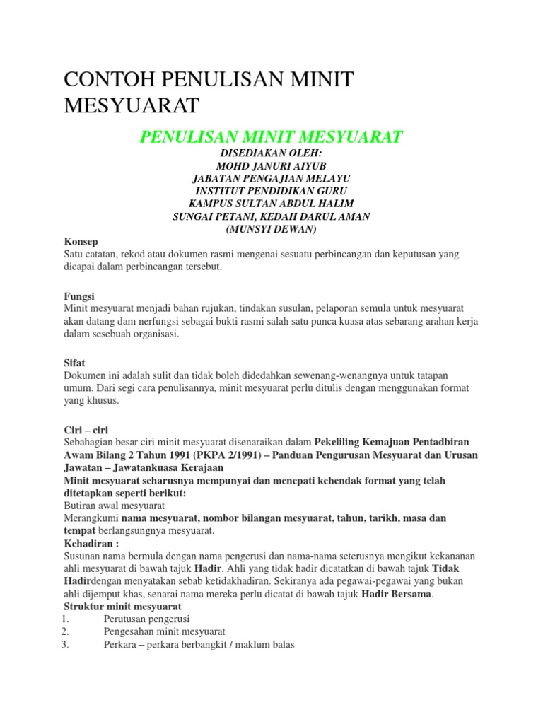 Berikut disertakan cara buat dan contoh minit mesyuarat yang berkualiti lengkap dan mudah beserta maklumat format dan contoh. Minit mesyuarat panitia bahasa melayu kali ke 2 2012. Pengesahan minit terdahulu dan pindaan.