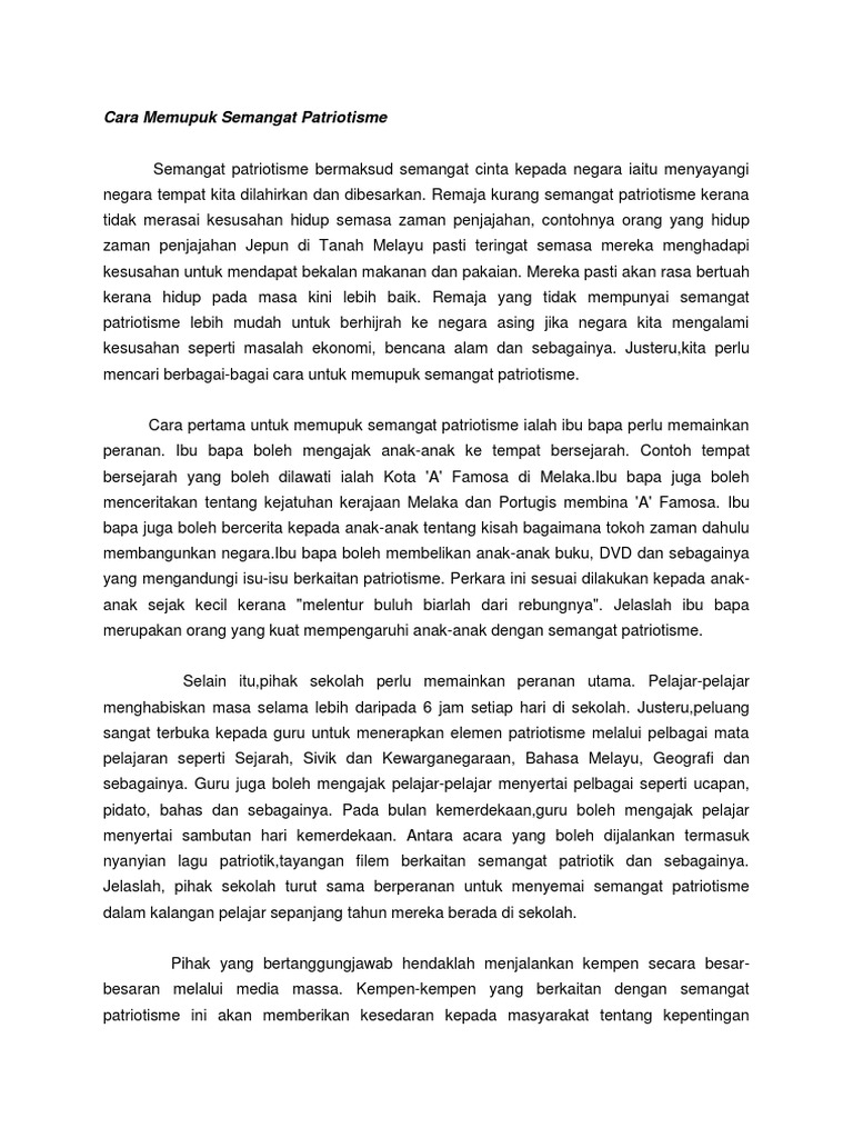 Cara memupuk semangat patriotisme dalam kalangan masyarakat. Semangat patriotisme dalam kalangan remaja. Kempen kempen yang berkaitan dengan semangat patriotisme ini akan memberikan kesedaran kepada masyarakat tentang kepentingan semangat patriotik dalam kalangan masyarakat di negara kita. Mohd shah farhan semangat patriotik semakin luntur dalam kalangan masyarakat di negara kita pada masa ini seperti yang didakwa oleh banyak pihak. Maka berikut dikongsikan contoh karangan langkah memupuk semangat patriotik dalam kalangan masyarakat untuk panduan semua.
