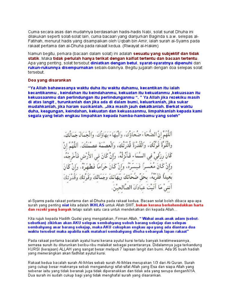 Sekiranya anda sedang mencari panduan solat serta doa dhuha yang betul anda berada di tempat yang betul. Jumlah minimum rakaat ialah dua rakaat dan boleh buat tanpa had rakaat seperti enam lapan dan 12 rakaat. Tidak ada doa sholat dhuha khusus yang diajarkan rasulullah shallallahu alaihi wasallam dalam hadits shahih. Artikel ini mengandungi segala yang anda ingin ketahui tentang solat dhuha serta pertanyaan lazim tentang cara mengerjakannya.