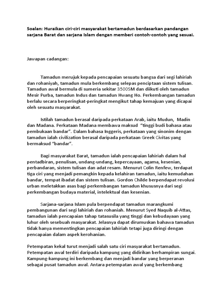 3 perubahan kehidupan sebuah masyarakat yang tidak bertamadun kepada kehidupan bertamadun boleh berlaku secara beransur ansur atau secara drastik. Kedudukannya yang strategik 1 petempatan awal masyarakat bertujuan. Grafik di bawah merupakan ringkasan kepada sesebuah tamadun dan faktor faktor yang mengakibatkan keruntuhan sesebuah tamadun. Agama dan kepercayaan memadai jika wujudnya kepercayaan kepercayaan yg berkait an animisme atau penyembahan dewa dewa ciri ciri masyarakat bertamadun mengikut sarjana islam.