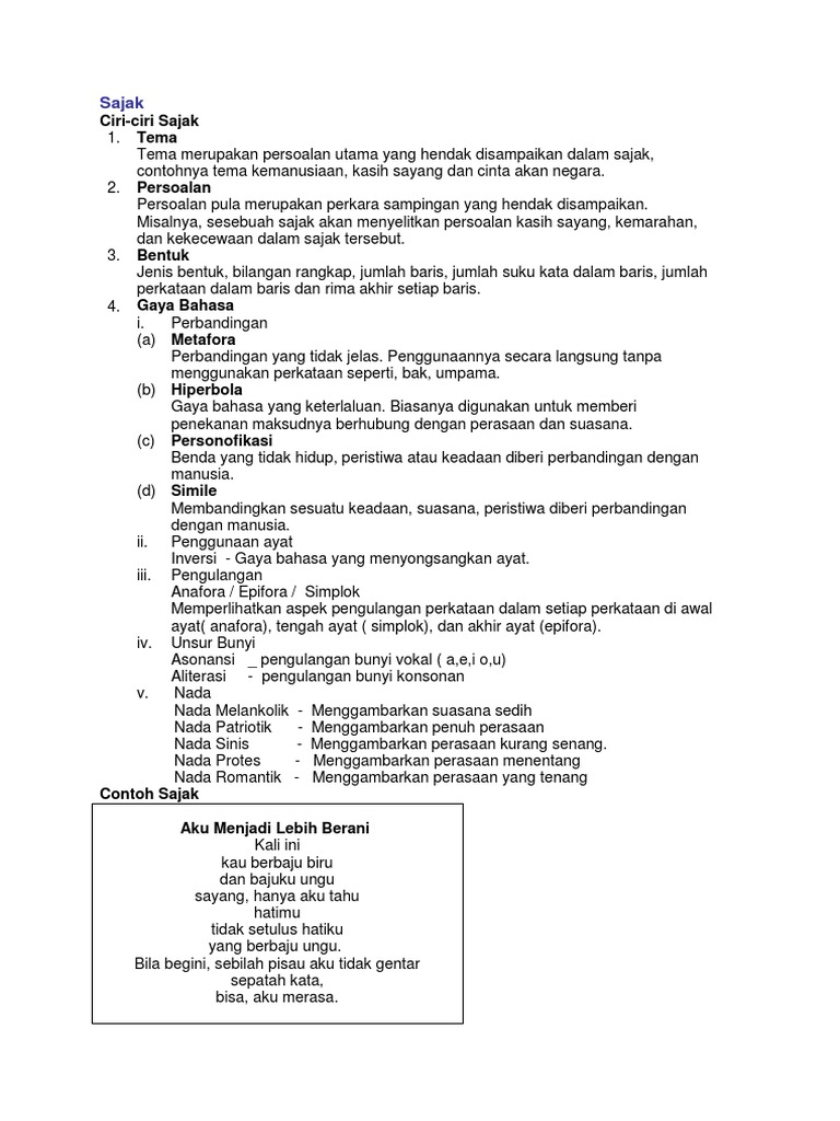 D bilangan katanya satu hingga enam patah kata sebaris. Ciri ciri puisi dan penjelasannya puisi adalah sebuah bentuk karya sastra dengan pemilihan kata yang indah dan terikat dengan unsur irama ritma diksi dan gaya bahasa. Bentuk dan ciri ciri sajak a berbentuk bebas. Semoga perkongsian nota nota rujukan bahasa melayu contoh contoh karangan bahan bahan pembelajaran dan pengajaran pt3 pentaksiran tingkatan 3 tingkatan 1 tingkatan 2 tingkatan 3 dalam post di blog bumi gemilang berguna dan dapat membantu para.