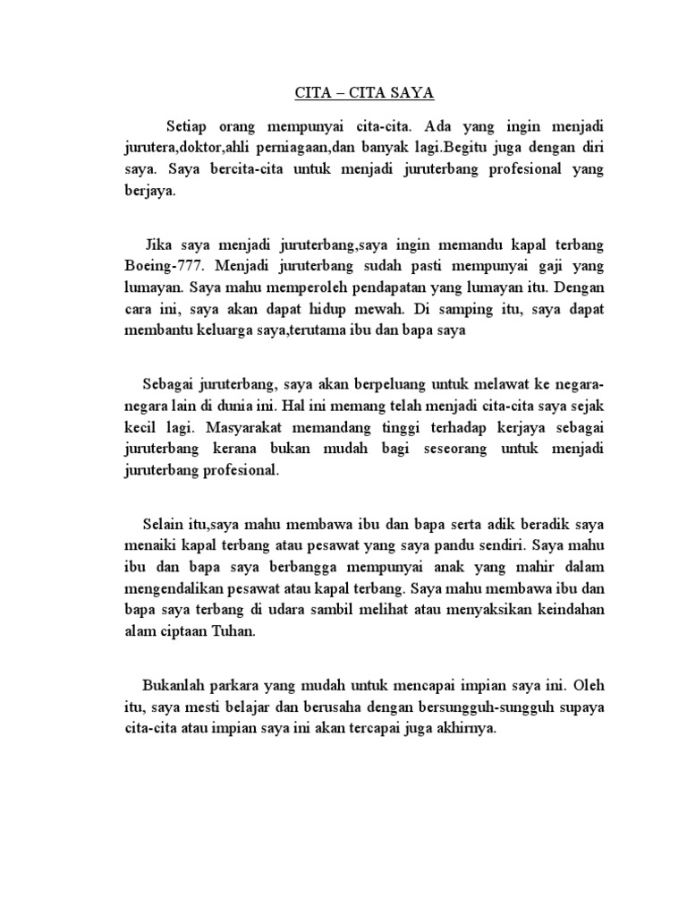 Cita cita saya menjadi doktor. Karena disaat kita kecil kita selalu dibahagiakan orang tua. Kebanyakan orang ada cita cita. Selain itu cita cita ialah satu keinginan atau satu hasrat yang mendalam di dalam hati. Sebagai seorang pelajar saya juga mempunyai cita cita cita cita saya ialah menjadi seorang doktor.