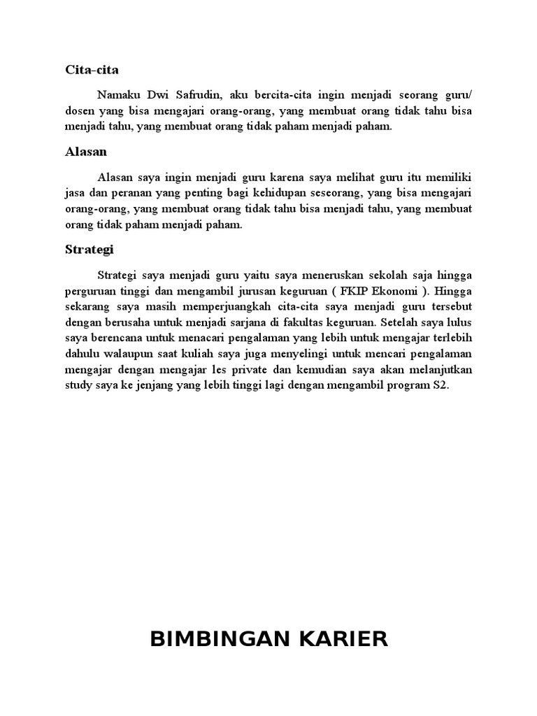 Dan anda ingin tahu karangan tentang cita cita menjadi guru. Menjadi seseorang yang membuat hidupnya ikut campur dalam kemajuan pendidikan generasi kita untuk mencapai kehidupan yang lebih baik. Academia edu is a platform for academics to share research papers. Guru adalah pekerjaan yang sangat mulia.