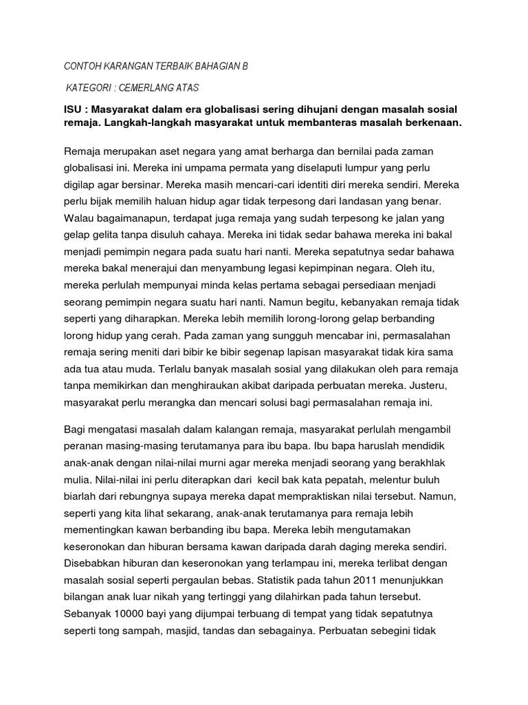 Contoh karangan bahagian b spm. Karangan bahasa melayu spm bahagian b peranan ibu bapa membentuk masyarakat penyayang 6 46 pm contoh karangan spm karangan spm karangan spm bahagian b perasaan saling menyayangi dan hormat menghormati sesama ahli keluarga dapat membentuk masyarakat penyayang. Spm komsas penulisan tatabahasa nota stpm novel tingkatan 4 tingkatan 5 karangan a pmr pt3 tingkatan 1 info kesusasteraan morfologi universiti rumus teknik aktiviti bahasa guru jurnal teks pengacaraan pengacaraan sajak soalan jawapan peribahasa antologi jaket kulit kijang dari istanbul pengolongan kata ujian mata isu semasa prosa tradisional latihan novel sejambak bakti novel silir daksina. Calon spm wajib menduduki semua kertas peperiksaan bagi mata pelajaran yang didaftar. Bahagian a merupakan karangan yang berpandukan bahan rangsangan yang diberikan seperti gambar gambar rajah dan petikan.