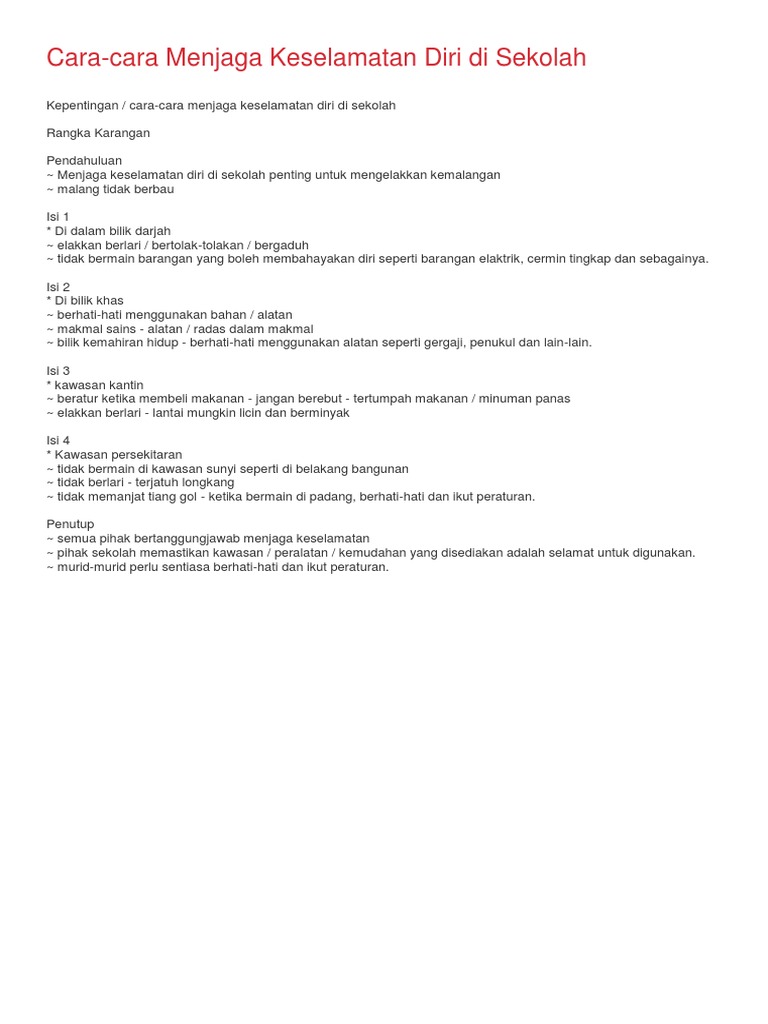 Contoh karangan langkah langkah keselamatan di sekolah. Karangan spm bahagian a ciri langkah mewujudkan sekolah selamat sekolah atau alma mater merupakan tempat kita belajar. Langkah langkah keselamatan dimaksudkan sebagai sebarang usaha yang dilakukan oleh mana mana pihak sekolah ibu bapa masyarakat atau agensi agensi berkenaan bagi mewujudkan keadaan atau persekitaran yang selamat di sekolah. Oleh itu satu proses prosedur keselamatan mengenai tatacara penggunaan sesuatu empat perlu disebarkan dan disampaikan dalam bentuk risalah atau poster. Langkah langkah memupuk minat membaca.