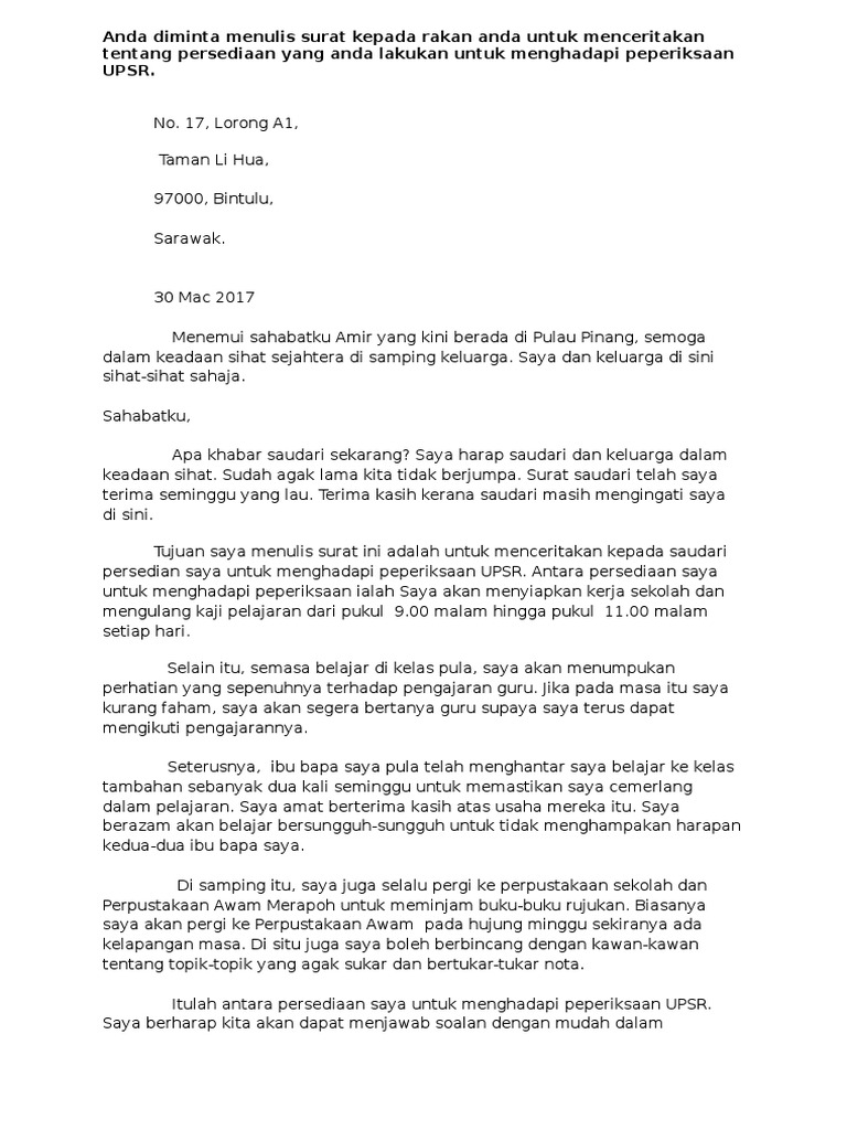 Panjangnya huraian anda hendaklah tidak melebihi 120 patah perkataan. Setiap pelajar pastinya akan menduduki peperiksaan yang telah ditetapkan. Kamu dan rakan kamu itu telah berbual bual tentang persediaan menghadapi ujian pencapaian sekolah rendah upsr yang akan menjelang tidak lama lagi. Bagaimana dengan persediaan saudara untuk menghadapi peperiksaan upsr yang akan kita hadapi pada bulan september nanti.
