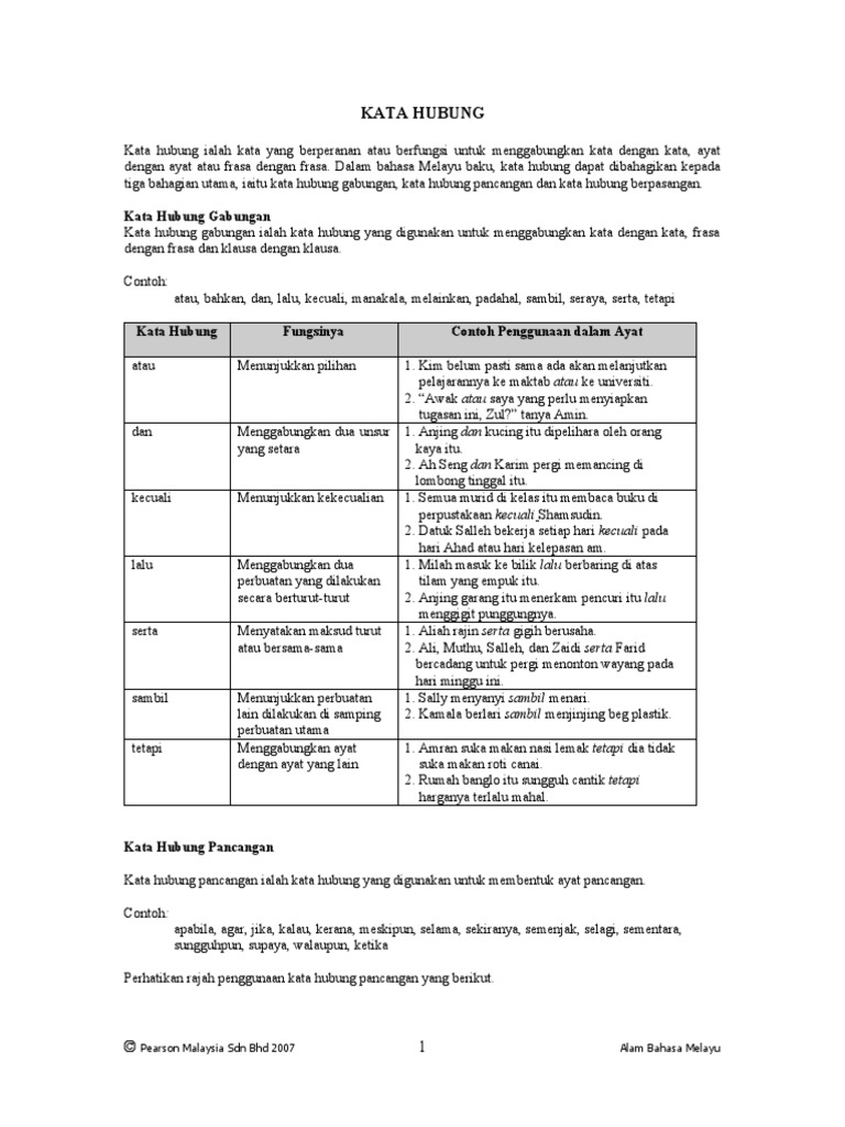 1 digunakan untuk menghubungkan kata dengan kata frasa dengan frasa dan ayat dengan ayat. Dia sengaja tidak membelanjakan semua gajinya supaya dia bisa menabung. Menurut kamus dewan edisi ke 4 hubungan ialah kaitan pertalian sangkut paut. Penggunaan kata hubung objektif umum.