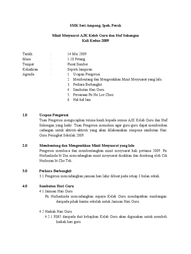Minit mesyuarat bilangan pertama tahun 2014 hari tarikh. Beliau memaklumkan kepada ahli mengenai objektif dan matlamat mengadakan mesyuarat pada kali ini iaitu pembubaran ajk penaja dan. 6 orang turut hadir jika ada. Contoh minit mesyuarat kewangan sekolah contoh minit mesyuarat terkini contoh minit mesyuarat pengurusan kualiti contoh minit mesyuarat persatuan contoh minit mesyuarat jabatan contoh minit mesyuarat peningkatan kualiti contoh minit mesyuarat guru dan taklimat contoh minit mesyuarat contoh minit mesyuarat mbj contoh minit mesyuarat persatuan contoh minit curai kursus contoh minit.
