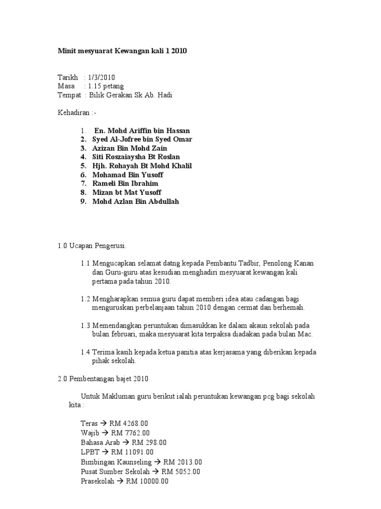 Contoh minit mesyuarat kewangan sekolah kali pertama 2019. Sebelum kita muat turun contoh minit mesyuarat mari kita lihat panduan membuatnya yang betul. Minit mesyuarat panita agama islam 14. Bilik guru 3. Minit mesyuarat kewangan pertama sekolah kebangsaan sungai suloh bagi tahun 2011.