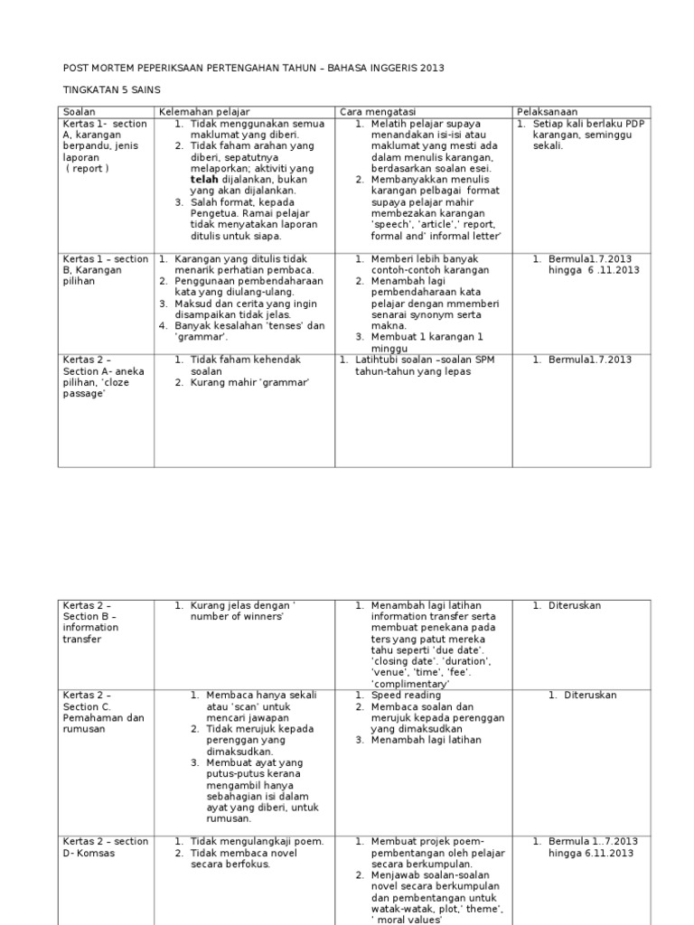 Arab keputusan peperiksaan kertas bahasa arab bagi peperiksaan pertengahan tahun secara umumnya tidak memuaskan. Link di bawah adalah tapak contoh laporan post mortem. Contoh laporan post mortem penilaian pertengahan t. Harap maklum bahawa jika tuan tuan dan puan puan mengajar subjek yang sama di kedua dua kelas krk cthnya.