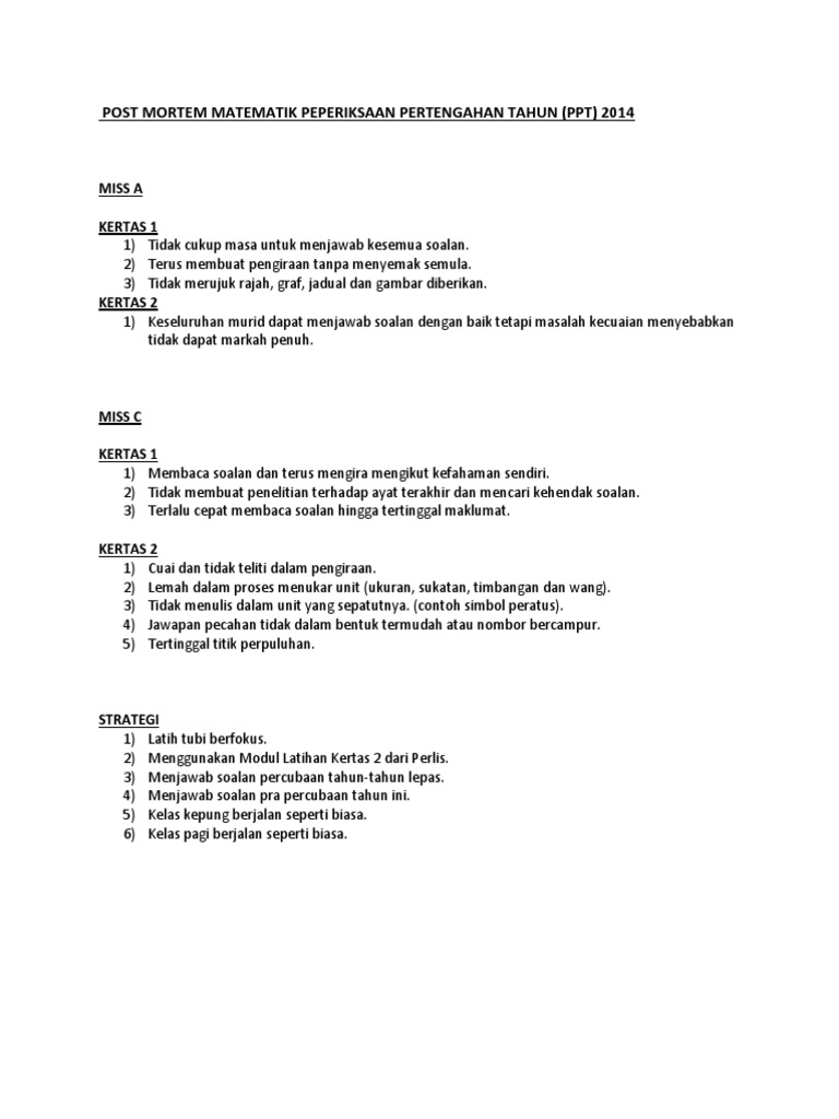 Post mortem subjek b. Teka silang islamik sempena isra mikraj june 1 may 1. Mesyuarat post mortem peperiksaan pertengahan tahun ppt tahun 6 telah diadakan melibatkan semua guru yang mengajar subjek teras tahun 6 bersama guru besar. Berdasarkan surat daripada ppd lms berkaitan mesyuarat post mortem peperiksaan pertengahan tahun 2016 semua guru sktt diminta untuk mengisi laporan post mortem sebelum 24 jun 2016.