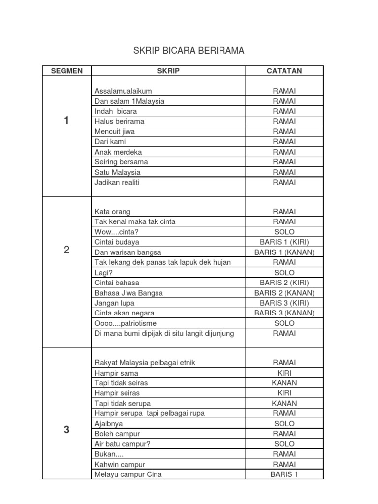 Ini skrip bicara berirama yang sekolah aku guna tahun lepas. Nombor tema mesej 10 markah bahasa 40 markah cerita 30 markah watak 10 markah kreativiti 5 markah markah bonus 5 markah jumlah markah. Bicara berirama tahun 2012. Skrip bicara berirama smk ringlet smk ringlet cameron highlands pahang.