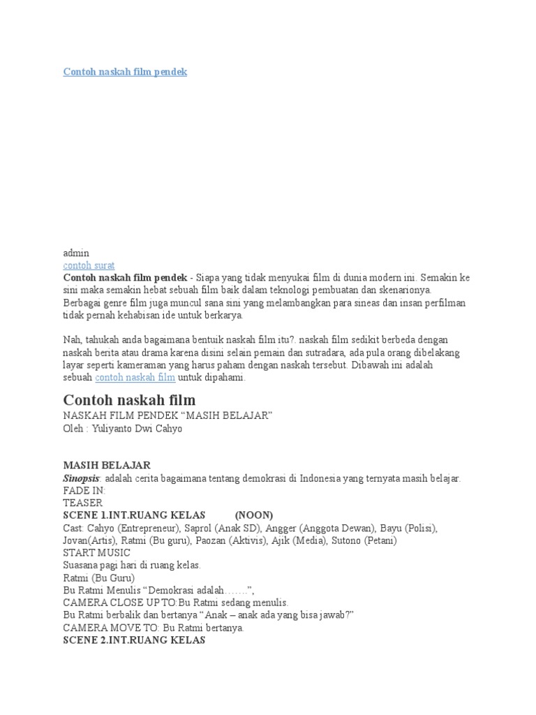 Contoh naskah film pendek motivasi komedi lucu fiksi sedih sekolah dan keluarga diulas dalam tulisan singkat ini. Adapun dalam proses pembuatan film maka memang harus dibuat terlebih dahulu skenarionya jadi bisa dikatakan skenario ini di buat pra produksi sebuah film. Academia edu is a platform for academics to share research papers. September 26 2017 at 10 18 am reply.
