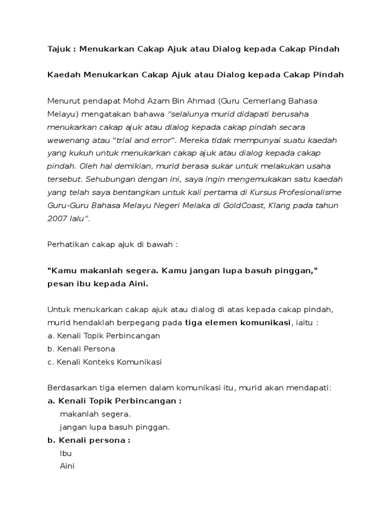 Kaedah ini juga membolehkan murid menukarkan cakap pindah kepada cakap ajuk atau dialog. Cakap ajuk dan cakap pindah ialah percakapan yang dilaporkan semula secara lisan atau tulisan tanpa mengubah maksudnya. Cakap pindah ahmad menasihati adiknya supaya tekun membuat kerja rumah. Anda sepatutnya tekun membuat kerja rumah kata ahmad kepada adiknya.