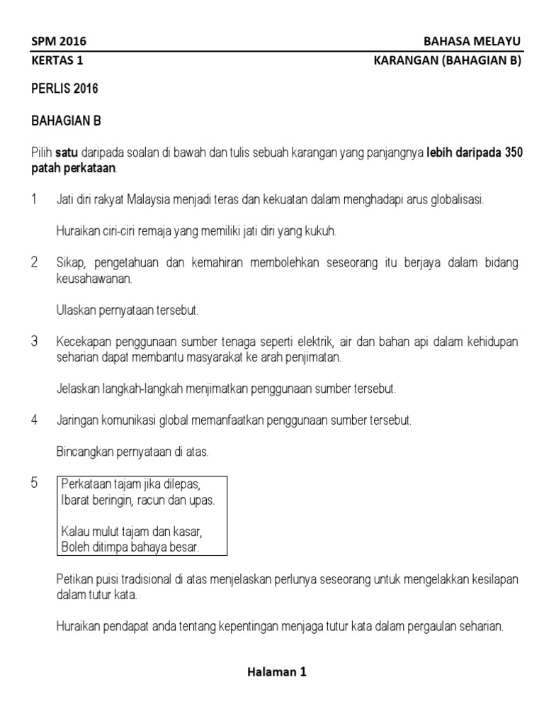 Ramalan karangan bahagian b bahasa melayu bm spm 2014 sijil pelajaran malaysia. Pada pandangan anda apakah punca yang menyebabkan berlkuny kes2 sedemkian dan cdngkan lngkah2 yg brkesan untk mengatasinya. Sebanyak 100 markah diperuntukkan untuk karangan bahagian b. Panjang karangan anda hendaklah lebih daripada 350 patah perkataan.