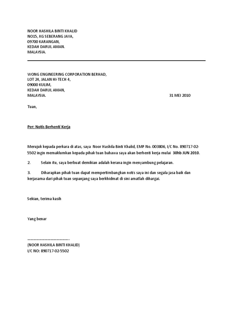 Contoh surat berhenti kerja 24 jam pdf 104 download 4bbbd60035. Contoh surat rasmi berhenti kerja 24 jam format surat rasmi berhenti kerja contoh surat rasmi berhenti sekolah contoh surat rasmi berhenti belajar contoh surat rasmi berhenti kolej contoh surat rasmi berhenti kerja kilang. Surat rasmi berhenti kerja terbaik dalam bahasa melayu dan inggeris resignation latter atau surat rasmi berhenti kerja notis sebulan seminggu atau 24 jam. Jenis dan format surat berhenti kerja notis 24 jam.