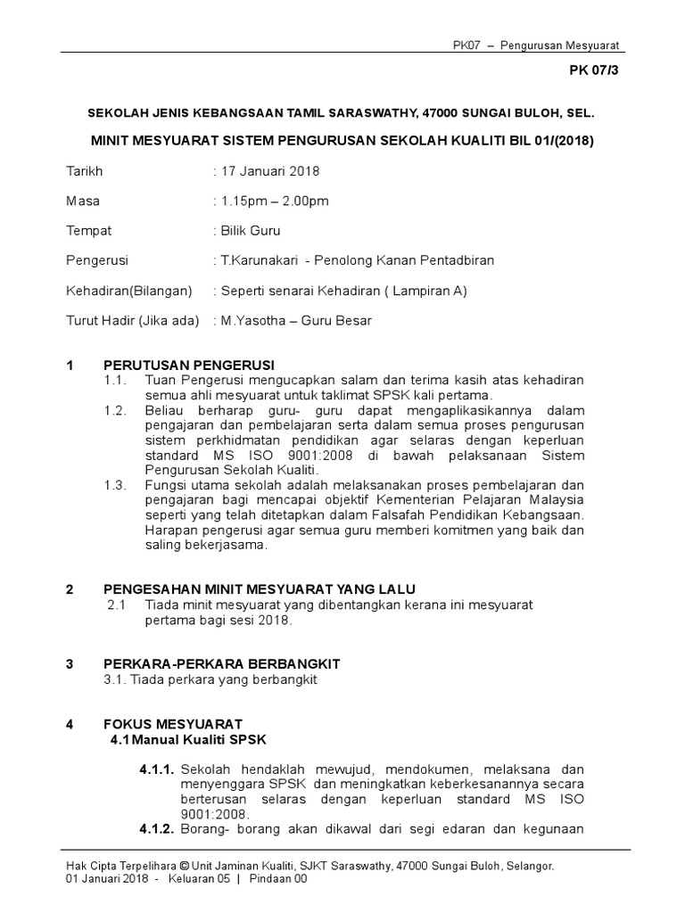 Contoh minit mesyuarat minit mesyuarat merupakan satu laporan mengenai perkara atau hal yang dibincangkan dan diputuskan dalam sesuatu mesyuarat. Pk 07 pengurusan menyusarat rujukan. Dokumen ini sangat penting kerana ia merupakan sumber rujukan masa hadapan terhadap. 3 julai 2013 kepada jawankuasa kerja tuan puan mesyuarat ajk kerja bulan kecergasan tahun 2013 dengan segala hormatnya perkara di atas adalah dirujuk.