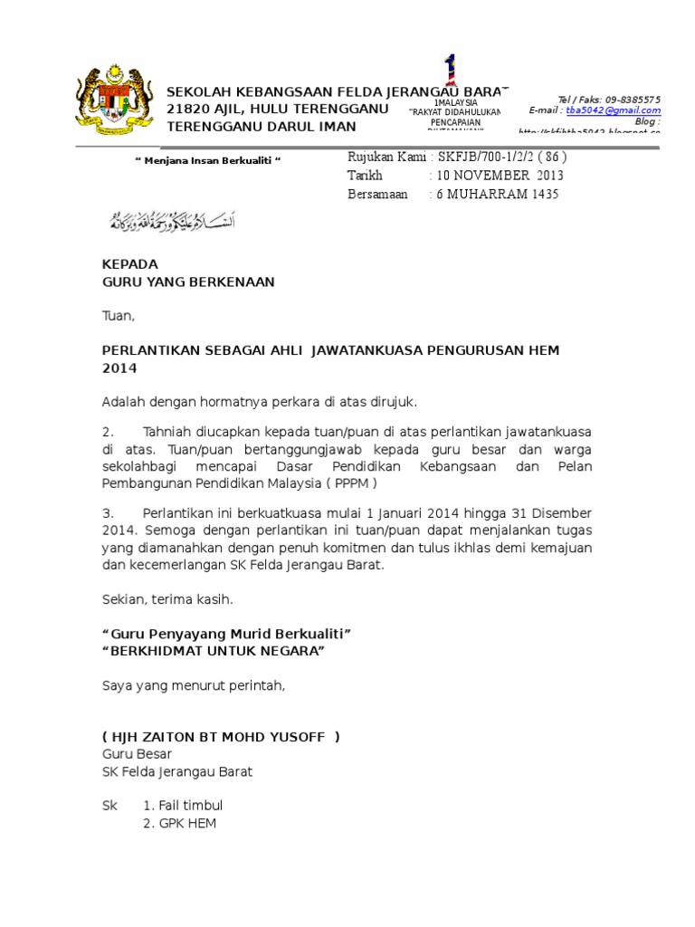 81500 pontian tel. Program ijazah sarjana muda perguruan dengan kepuj. Contoh surat rasmi lantikan jawatan 21 14 00 contoh surat lantikan contoh surat lantikan ajk muat turun surat lantikan berikut kami kongsikan beberapa contoh surat surat perlantikan jawantakuasa yang ada di sekolah. Inggeris 2 minggu sebelum program 3 pengesahan kehadiran penceramah ketua panitia b.