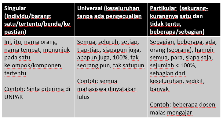 Kaliimat tanya kalimat perintah kalimat harapan dan kalimat inversi tidak dapa disebut proposisi. Misalnya term keluarga bangsa korps rombongan masyarakat partai dan lain sebaginya. Kopula berfungsi sebagai penghubung term subjek dan term predikat untuk menyatakan mengafirasi menegasi syarat keputusan. Predikat ialah bahagian yang menerangkan subjek.