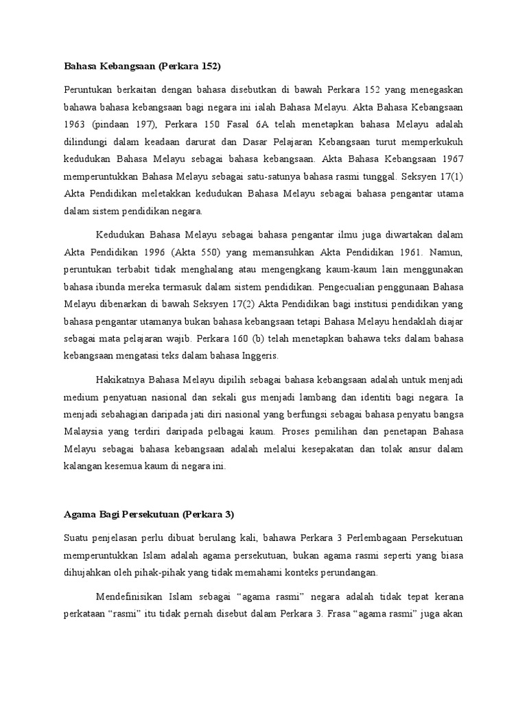 Dalam perlembagaan persekutuan bahasa kebangsaan termaktub di bawah perkara. Perlembagaan persekutuan perlembagaan persekutuan cetakan semula sebagaimana pada 1 november 2010 teks ini hanyalah terjemahan oleh jabatan peguam negara bagi federal constitution. Perkara152 ini telah mengiktiraf dan menjadikan bahasa melayu sebagai bahasa kebangsaan serta bahasa rasmi negara. 2 walau apa pun apa apa jua dalam perlembagaan ini tetapi tertakluk kepada peruntukan perkara 40 dan peruntukan perkara ini yang di pertuan agong hendaklah menjalankan fungsinya di bawah perlembagaan ini dan undang undang persekutuan mengikut apa apa cara yang perlu untuk meindungi kedudukan istimewa orang melayu dan anak negeri mana mana antara negeri sabah dan sarawak dan untuk. Perkara 152 perlembagaan persekutuan telah memainkan peranan penting menjadikan bahasa melayu sebagai asas pembinaan negara.