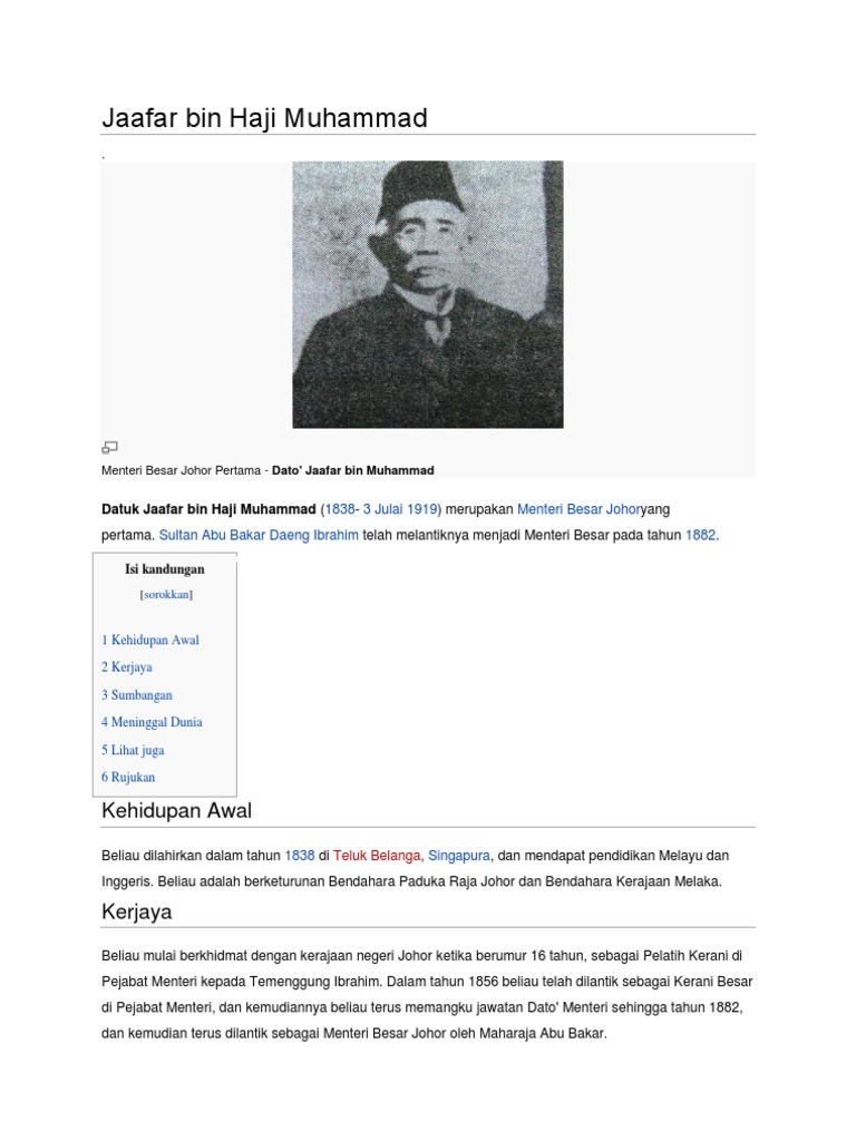 Jaafar was born in teluk belanga singapore straits settlements he also received malay and english education. Genealogy profile for dato jaafar menteri besar johor pertama 1886 1919 dato jaafar bin haji mohamed 1838 1919 genealogy genealogy for dato jaafar bin haji mohamed 1838 1919 family tree on geni with over 200 million profiles of ancestors and living relatives. Beliau dilahirkan dalam tahun 1838 di teluk belanga singapura dan mendapat. Was the first and longest serving dato menteri besar chief minister of malaysian state of johor an office he held from 1886 until his death.