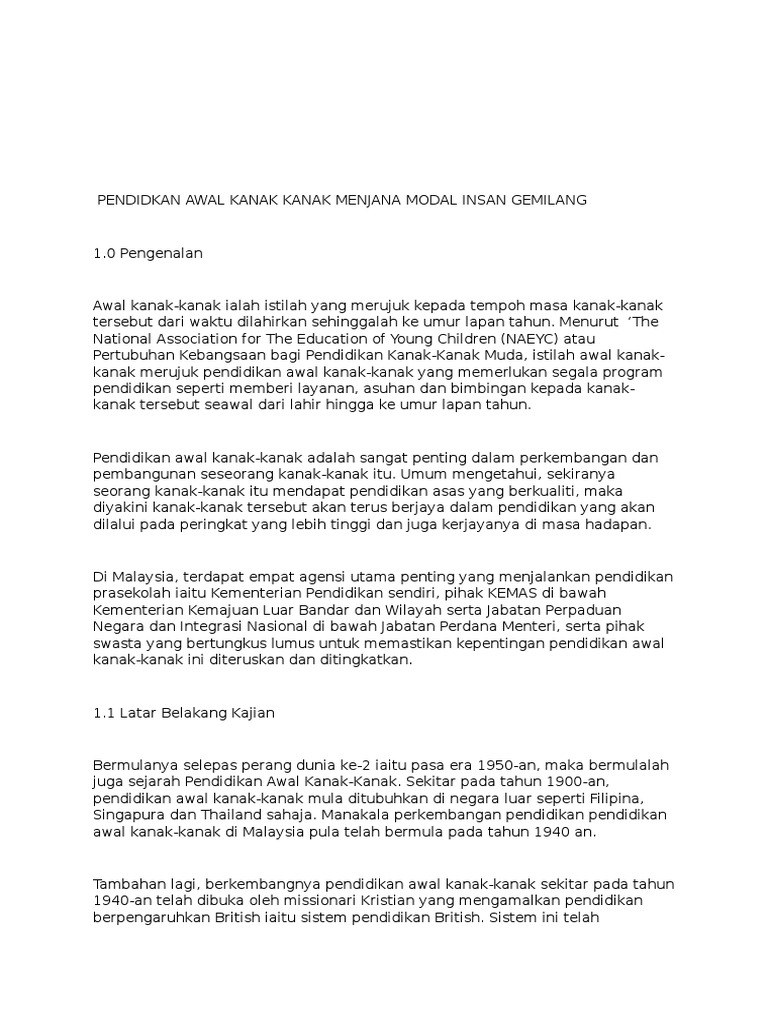 Definisi pendidikan awal kanak kanak dari perspektif barat dan islam. Pendahuluan pendidikan awal kanak kanak merupakan pendidikan peringkat awal usia kanak kanak. Bahasa melayu bahasa inggeris matematik dan sains merupakan mata pelajaran wajib dalam sistem pendidikan malaysia sekolah rendah awam di malaysia terbahagi kepada dua jenis iaitu sekolah kebangsaan dan sekolah jenis kebangsaan. Menerangkan konsep pendidikan awal kanakkanak di malaysia mengikut dua peringkat berdasarkan tahap umur kanak kanak.