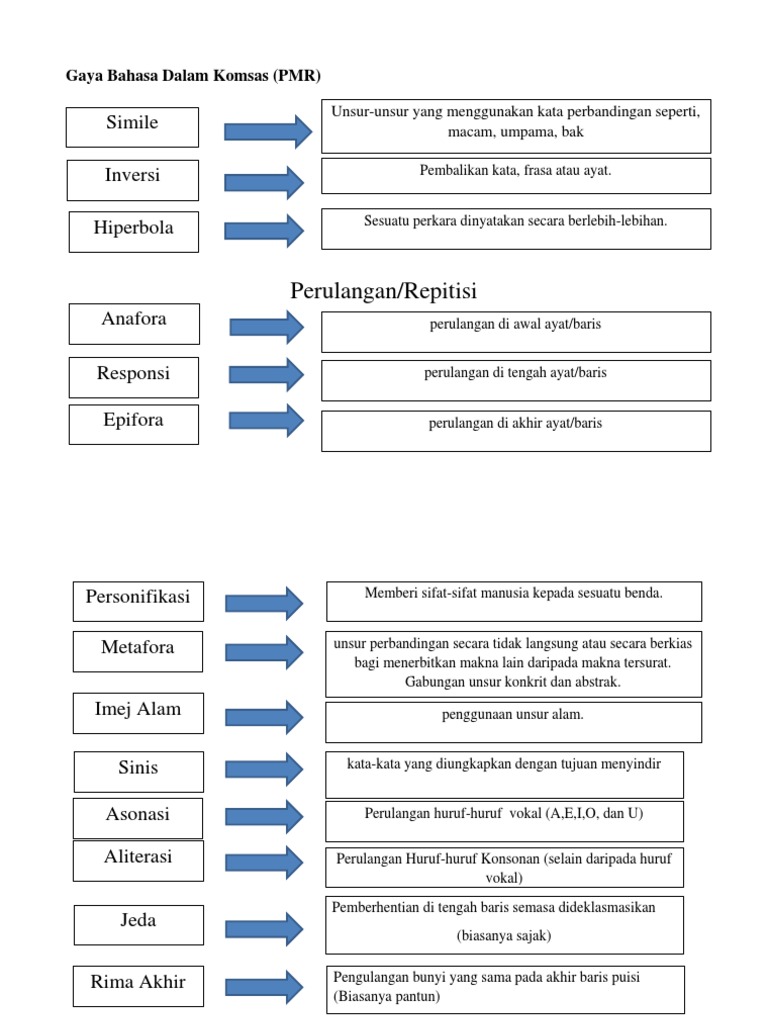 Berikut dihimpunkan jenis jenis gaya bahasa bersama istilah istilah yang berkaitan dengannya bagi memudahkan pelajar memahami konsep asas gaya bahasa secara menyeluruh. Gaya bahasa dalam komsas gaya bahasa dalam komsas gaya bahasa susunan kata yang digunakan oleh pengarang dalam usaha mengungkapkan tema dan persoalan dalam karya. Anafora pengulangan kata pada awal baris terbang kenanga terbang pohon terbang burung sering dipohon 2. Senarai gaya bahasa komsas 1.