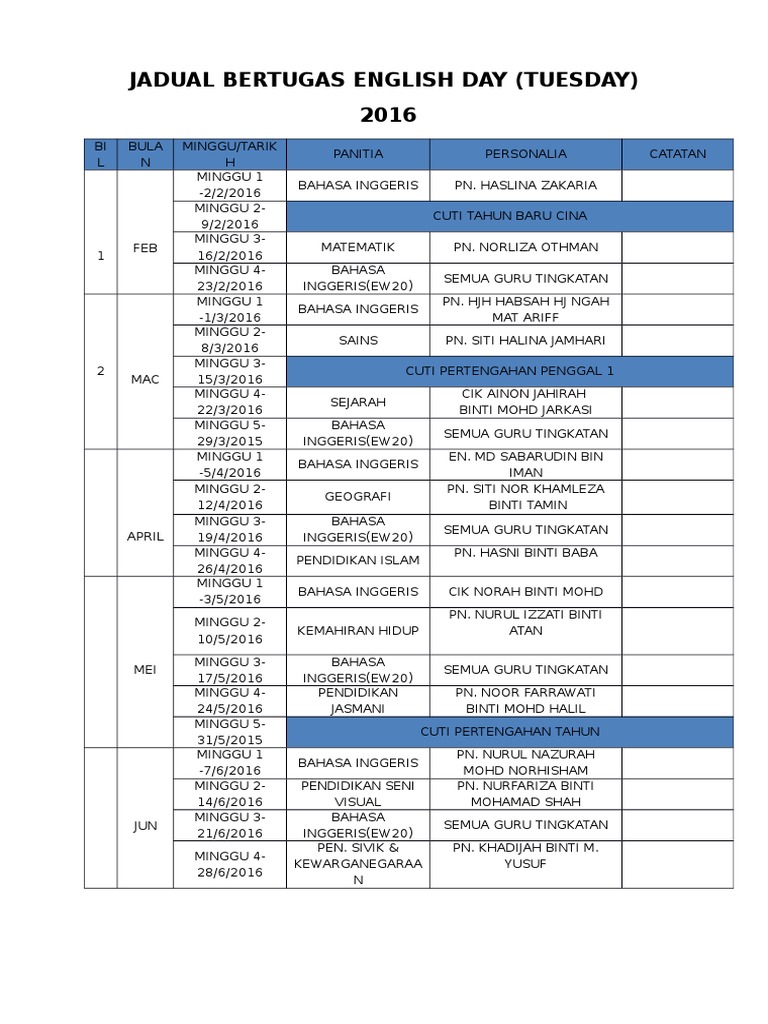 Jadual bertugas english day tuesday 2016 bi l 1 2 bula n feb mac april minggu tarik h minggu 1 2 2 2016 minggu 29 2 2016 minggu 316 2 2016 minggu 423 2 2016 minggu 1 1 3 2016 minggu 28 3 2016 minggu 315 3 2016 minggu 422 3 2016 minggu 529 3 2015 minggu 1 5 4 2016 minggu 212 4 2016 minggu 319 4 2016 minggu 426 4 2016 minggu 1 3 5 2016. Jadual bertugas english day 16 d4pq13m87rnp. Jan 22 2018 explore shalini kumar s board jadual bertugas kelas on pinterest. View as timetable minbar prayer times timetable generator.