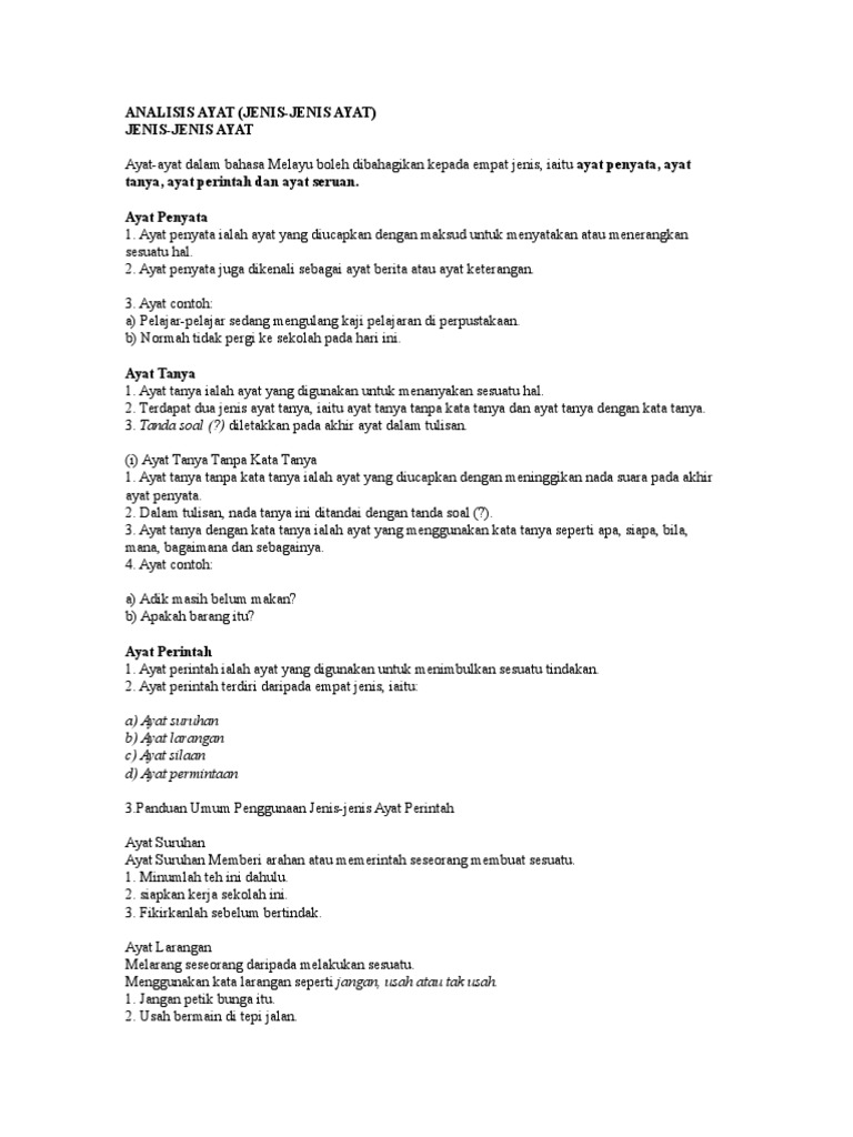 Jenis jenis ayat empat jenis ayat terdapat dalam bahasa melayu yang ditentukan oleh intonasi atau lagu bahasa serta tujuan penuturannya. A ayat penyata b ayat tanya c ayat perintah. Ayat penyata juga dikenali sebagai ayat berita atau ayat keterangan. Iv jangan merokok di dalam kawasan sekolah.