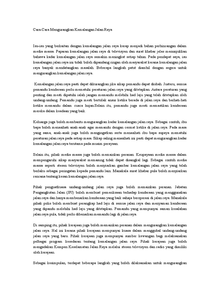 Karangan berhati hati di jalan raya. Kamu akan menyertai pertandingan syarahan peringkat sekolah. Walaupun kemalangan jalan raya boleh berlaku pada bila bila masa namun kita dapat berusaha untuk mengelakkan kemalangan sekiranya kita lebih berhati hati ketika berada dijalan raya. Dua lagi cedera dengan seorang daripadanya parah apabila bas dua tingkat sani express terbabas dan melanggar pembahagi jalan di km272 8 projek lebuh raya utara selatan plus. Bila otak jem.
