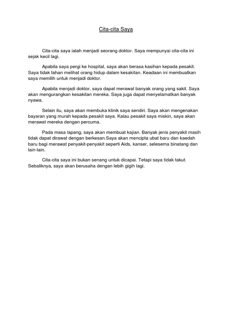 Cita cita saya setiap orang mempunyai cita cita. Tulis sebuah karangan yang bertajuk cita cita saya. Saya mula berminat untuk menjadi doktor sejak saya dimasukkan ke hospital setelah melihat tugas tugas seorang doktor. Cita cita itulah yang akan menjadi pendorong kepada seseorang untuk belajar bersungguh sungguh.