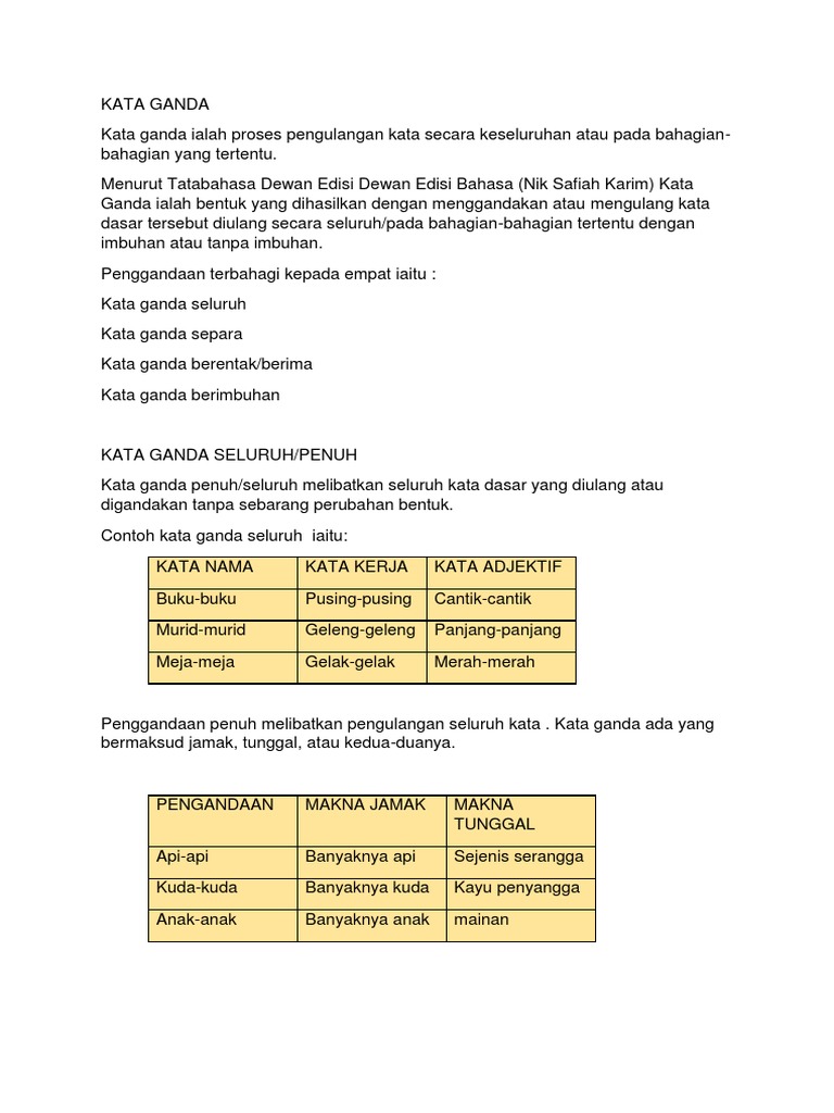 Kata ganda penuh kata ganda penuh atau pergandaan penuh bermaksud seluruh perkataan diulang tanpa mengalami perubahan bunyi atau bentuk sama ada berimbuhan atau tidak. Kata ganda berimbuhan ini diberi tanda sempang. Kata ganda berimbuhan ialah kata ganda yang ditambah dengan imbuhan sama ada yang berupa awalan akhiran apitan atau sisipan. Miss j 28 mac 2016 5 31 pg.