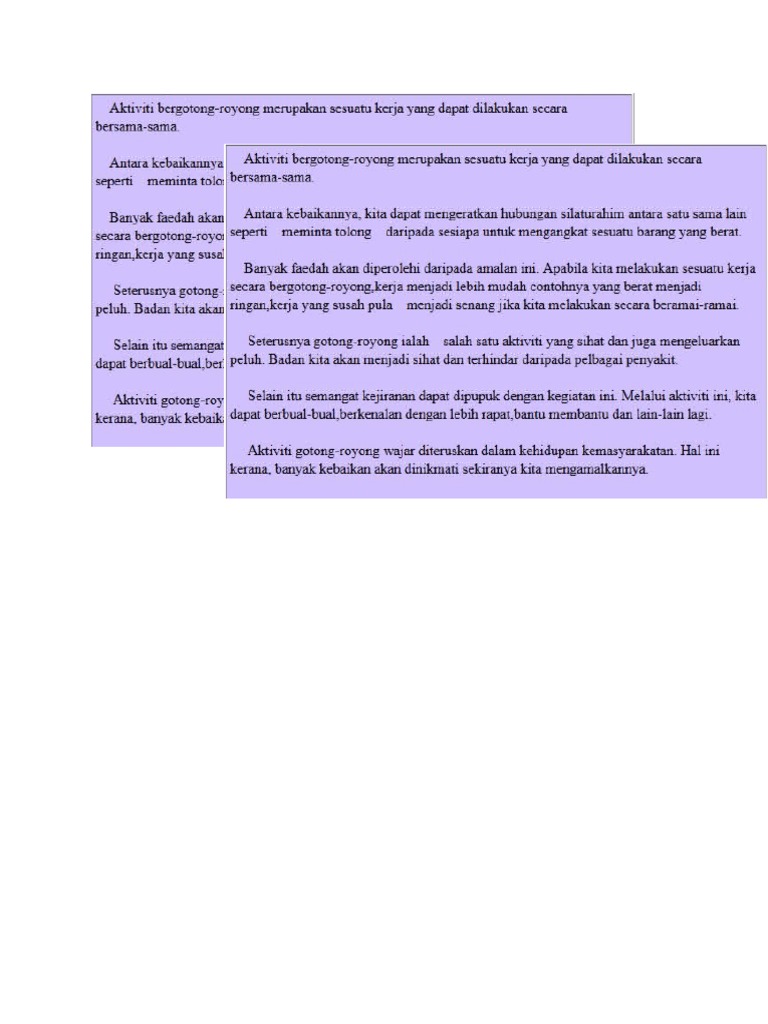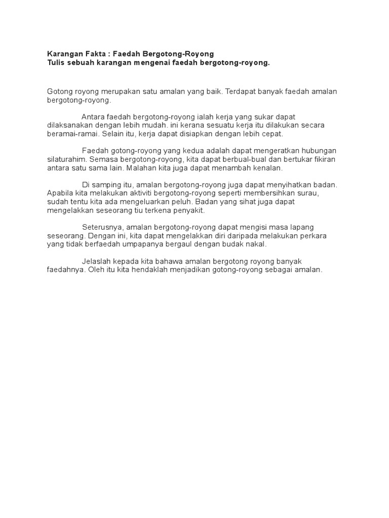 Kebaikan aktiviti gotong royong mengeratkan hubungan. Kesimpulannya aktiviti bergotong royong ini amat penting dan perlu dalam mengeratkan hubungan silaturrahim antara kaum. Seterusnya aktiviti gotong royong dapat meringankan serta memudahkan kerja yang sukar dilakukan ibarat kata peribahasa yang berat sama dipikul yang ringan sama dijinjing serta ke bukit sama di daki ke lurah sama dituruni. Hubungan silaturahim akan terjalin di samping bersama sama menyiapkan tugasan yang telah diberikan. Gotong royong merupakan suatu kegiatan yang dilaksanakan secara bersama sama dan bersifat suka rela agar kegiatan yang dikerjakan bisa berjalan dengan lancar mudah dan ringan.